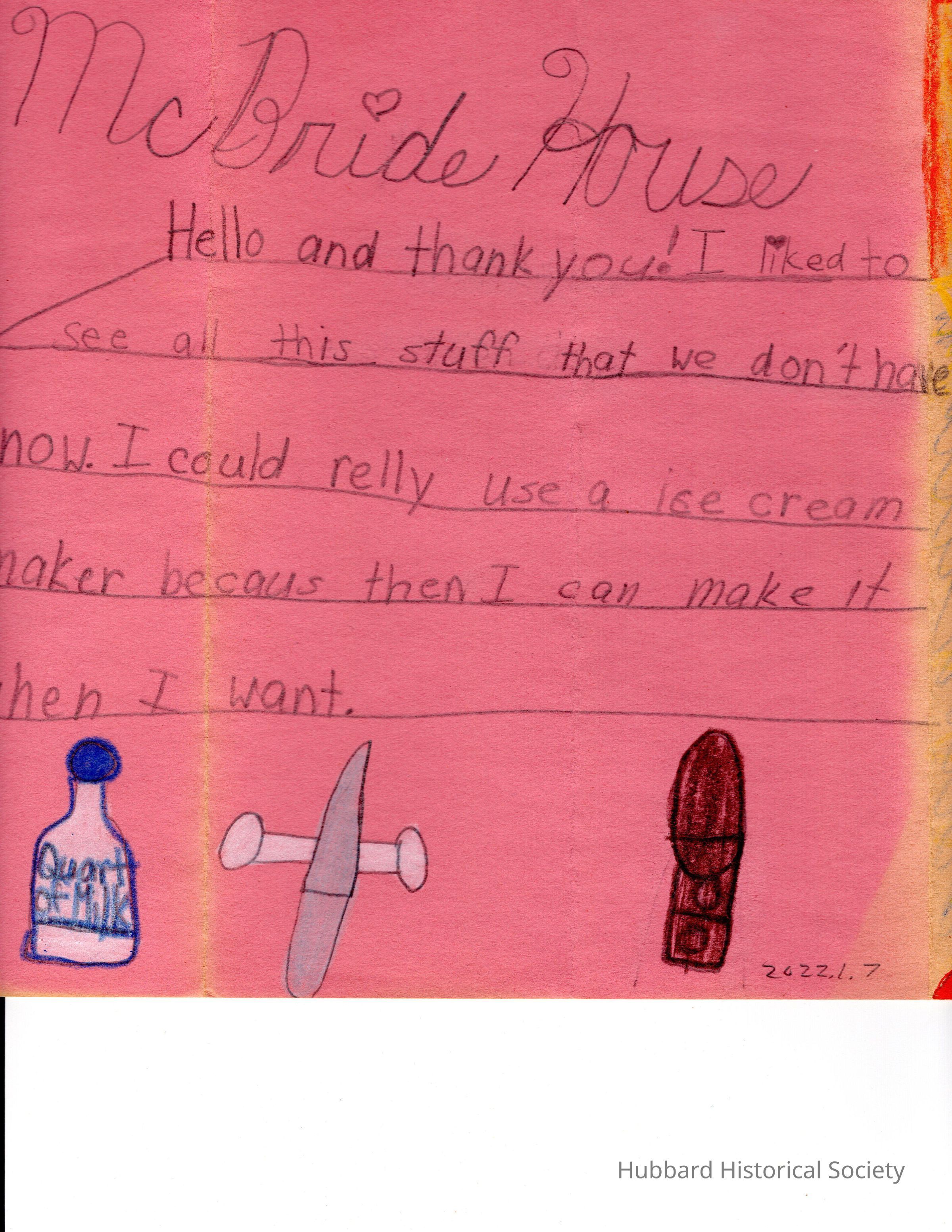 Thank You Card from Student for Tour of McBride HouseCataloged By