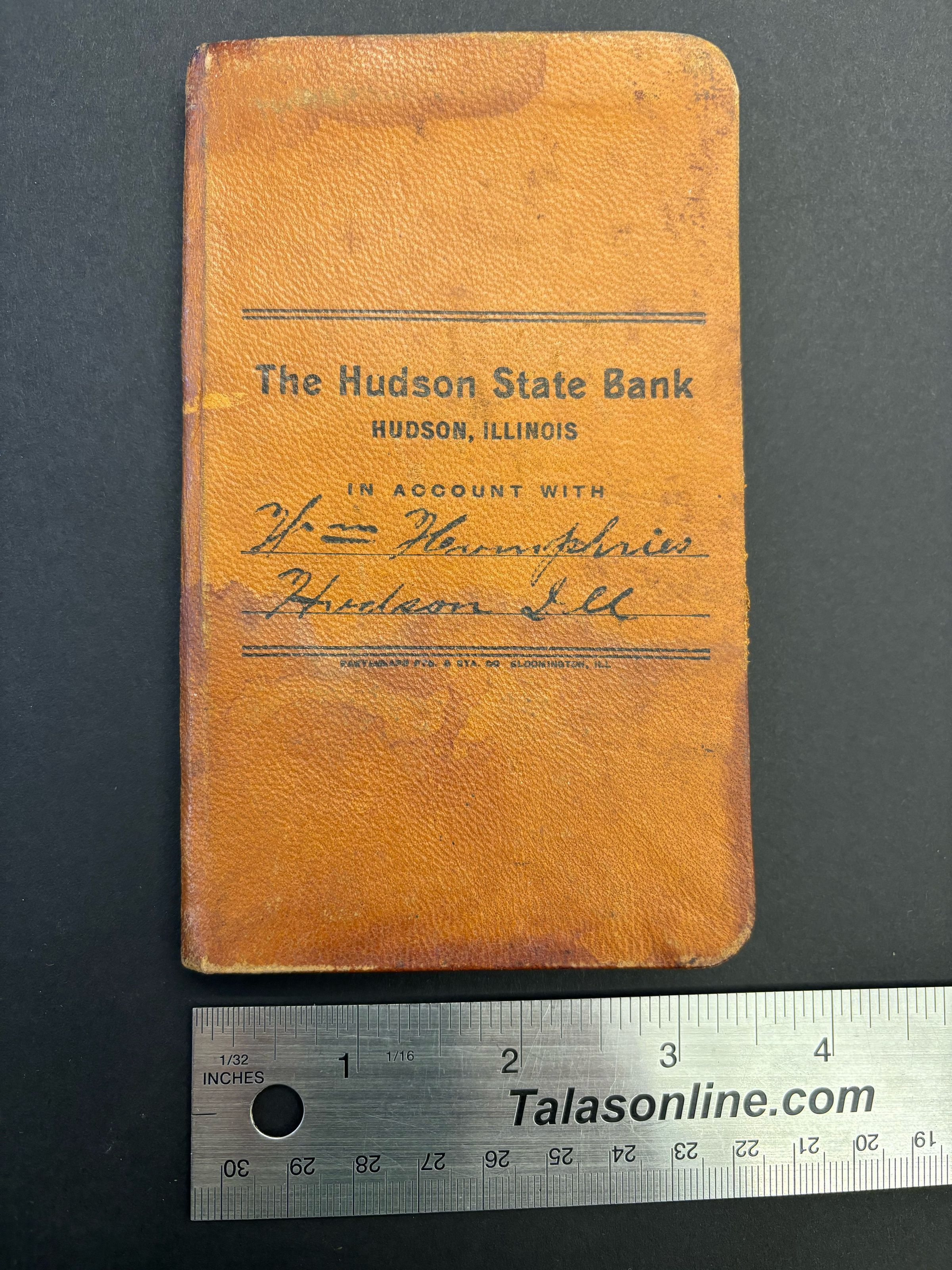 William Humphries, Hudson, IL bank book from The Hudson State Bank. Covering deposits & checks from May 9, 1907 to May 16, 1912.