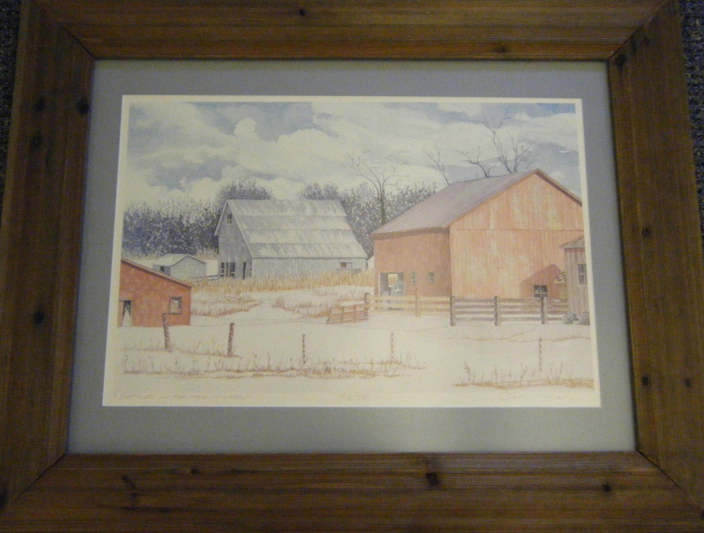 Watercolor print (75/500) framed in barn siding of a red barn and various other farm outbuildings in a snowcovered landscape.