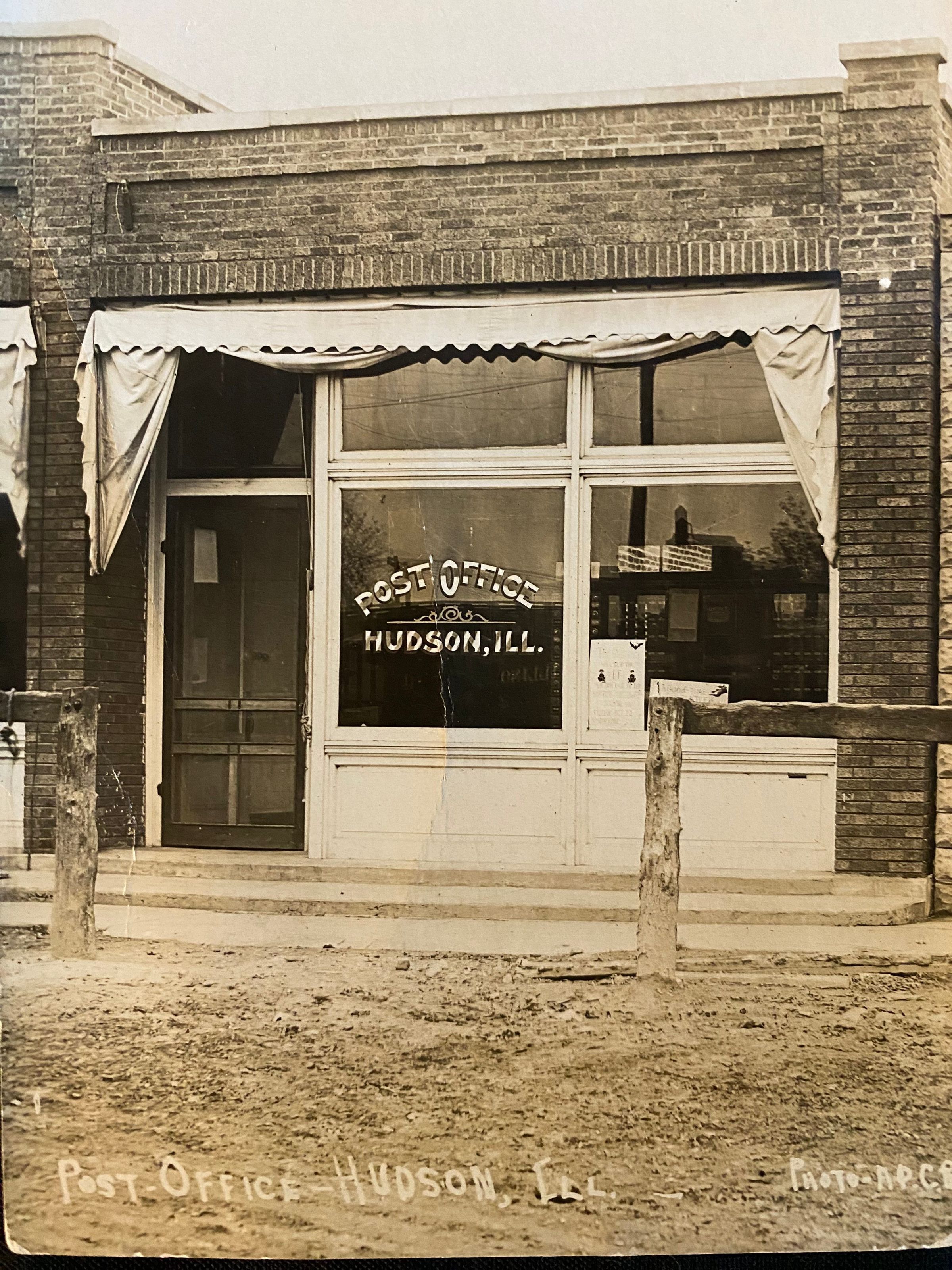 Picture postcard of the Post Office - Hudson, Ill. Circ 1915 building as part of the Hudson Store Corp. on Front Street, Hudson, IL