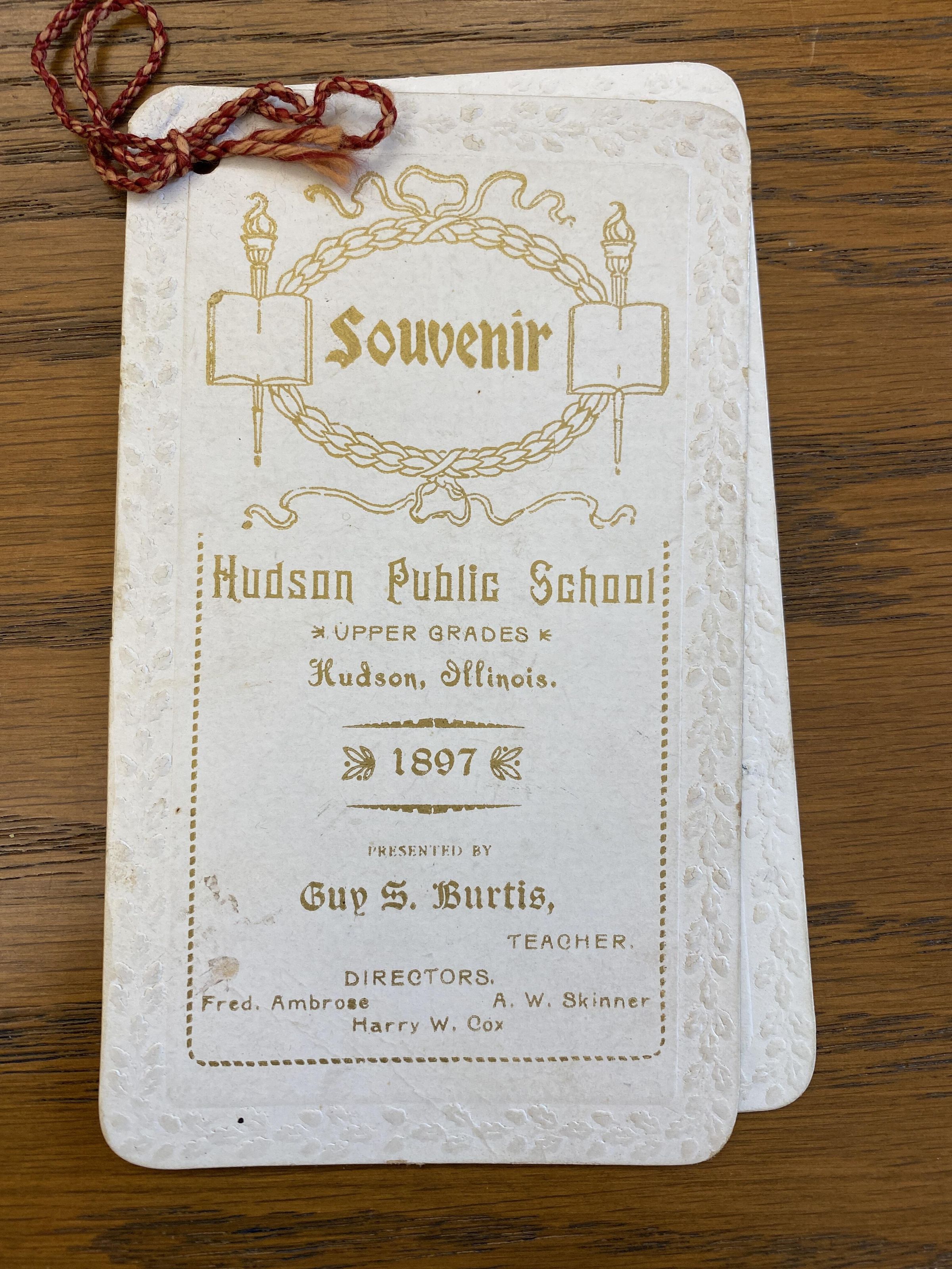 1897 School Year sourvenir booklet for the upper grades at Hudson Public School prepared by the teacher, Guy S. Burtis White booklet 3" x 5 3/4", tassled fastener (archival sleeve)