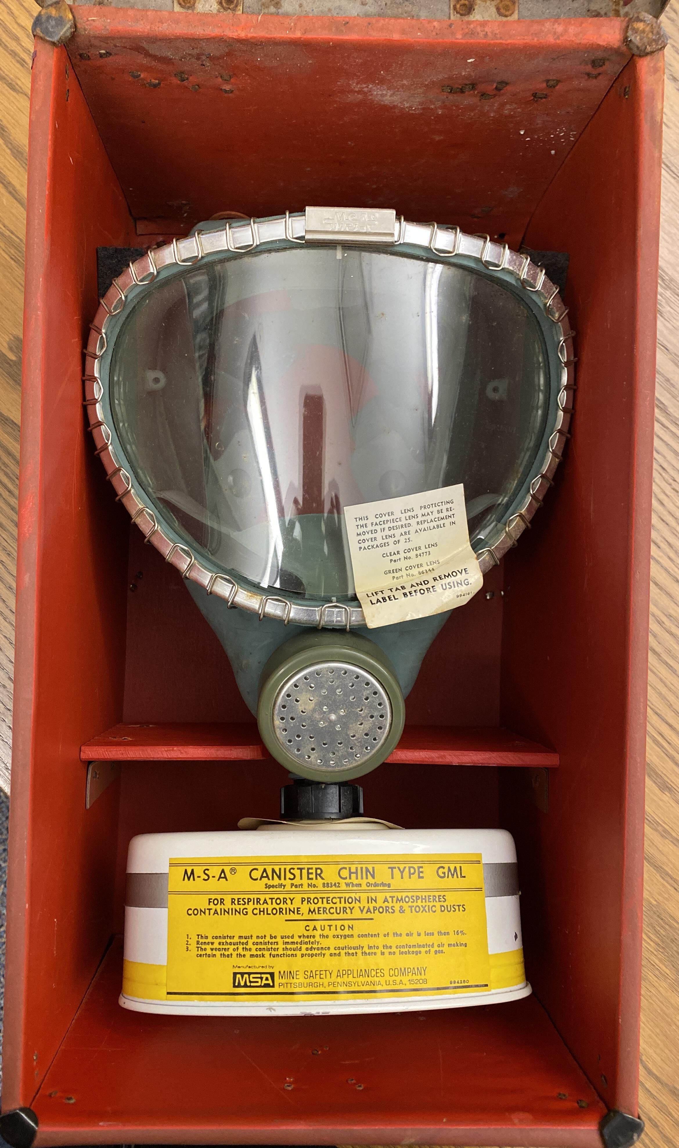 1960's M-S-A Chin Type Gas Mask with Case. Used for Civil Defense of Hudson, Illinois