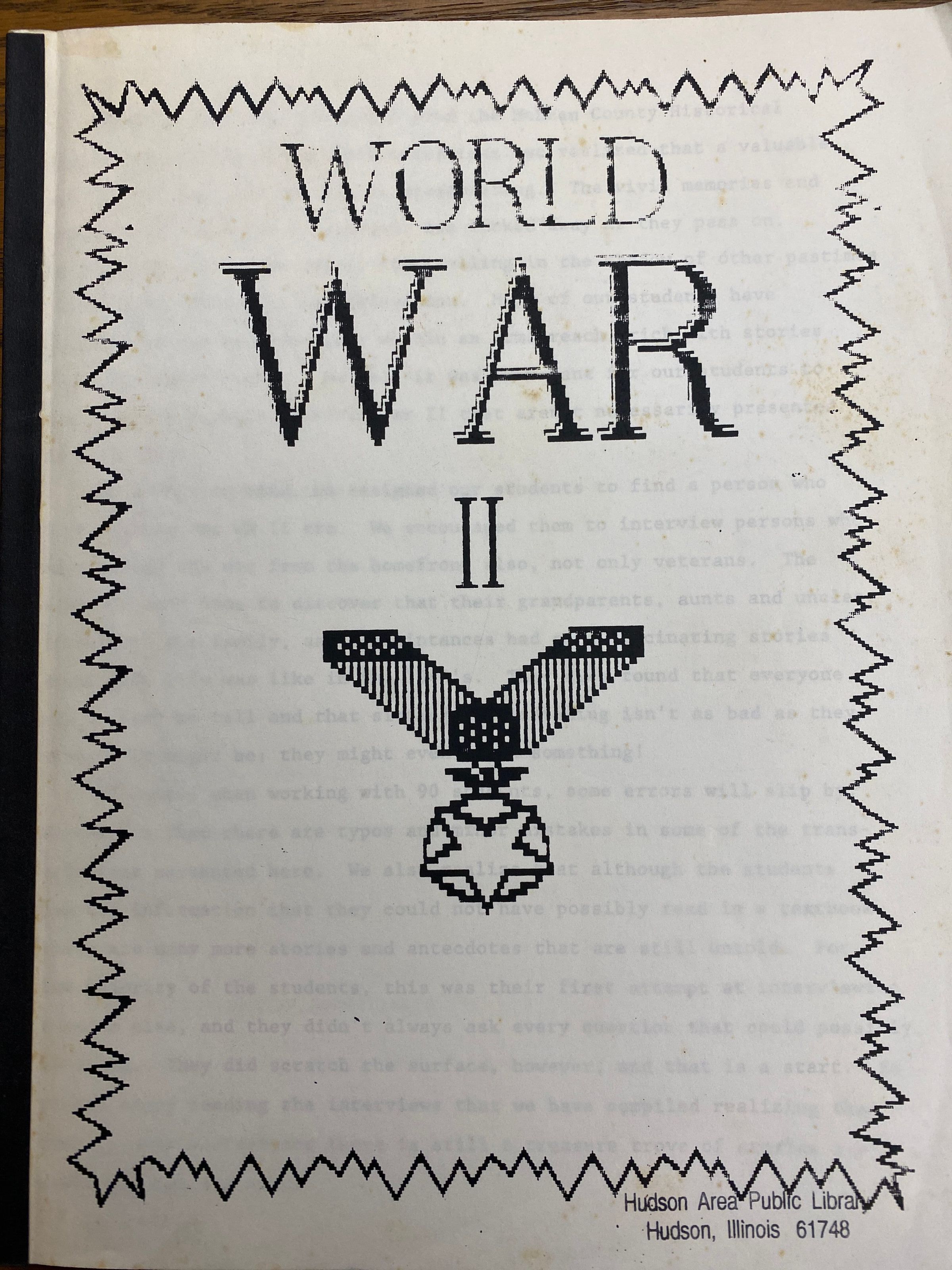 WW II Veterans' interviews requested by the McLean County Historical Society by unknown school class compiled in self-published form. Interviews in the year 1994. 8 1/2" x 11" - paper np