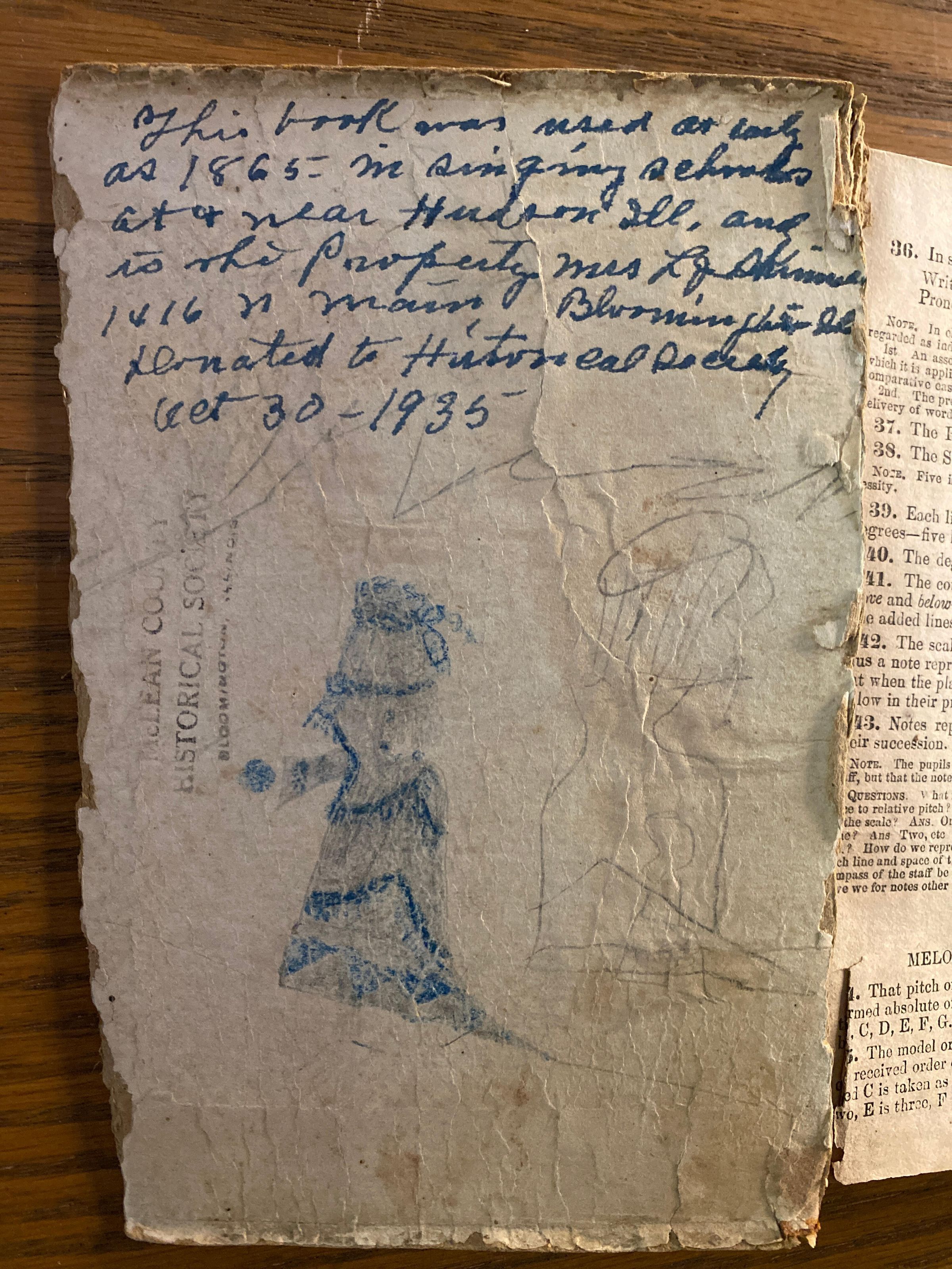 Music book used as early as 1865 in singing schools at and near Hudson, IL. It was the property of Mrs. L. J. Skinner Bloomington, IL. The first part of the book - pages 1 through 6 have been removed. The music book was no doubt used at the Skinner School