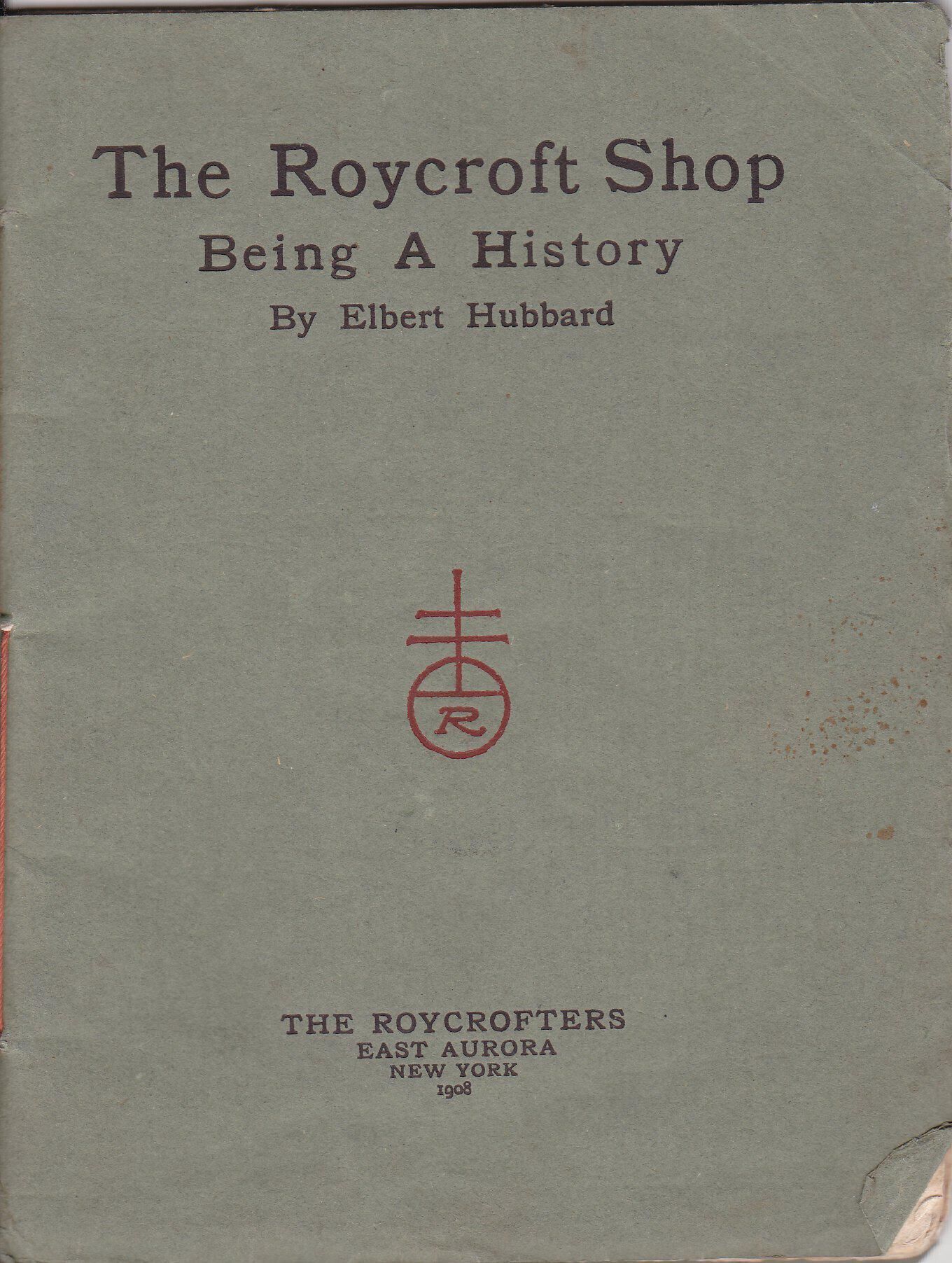 Booklet called The Roycroft Shop: Being A History by Elbert Hubbard. Green paper cover showing wear, 4 1/2 x 6, 29 pages, published by the Roycrofters.