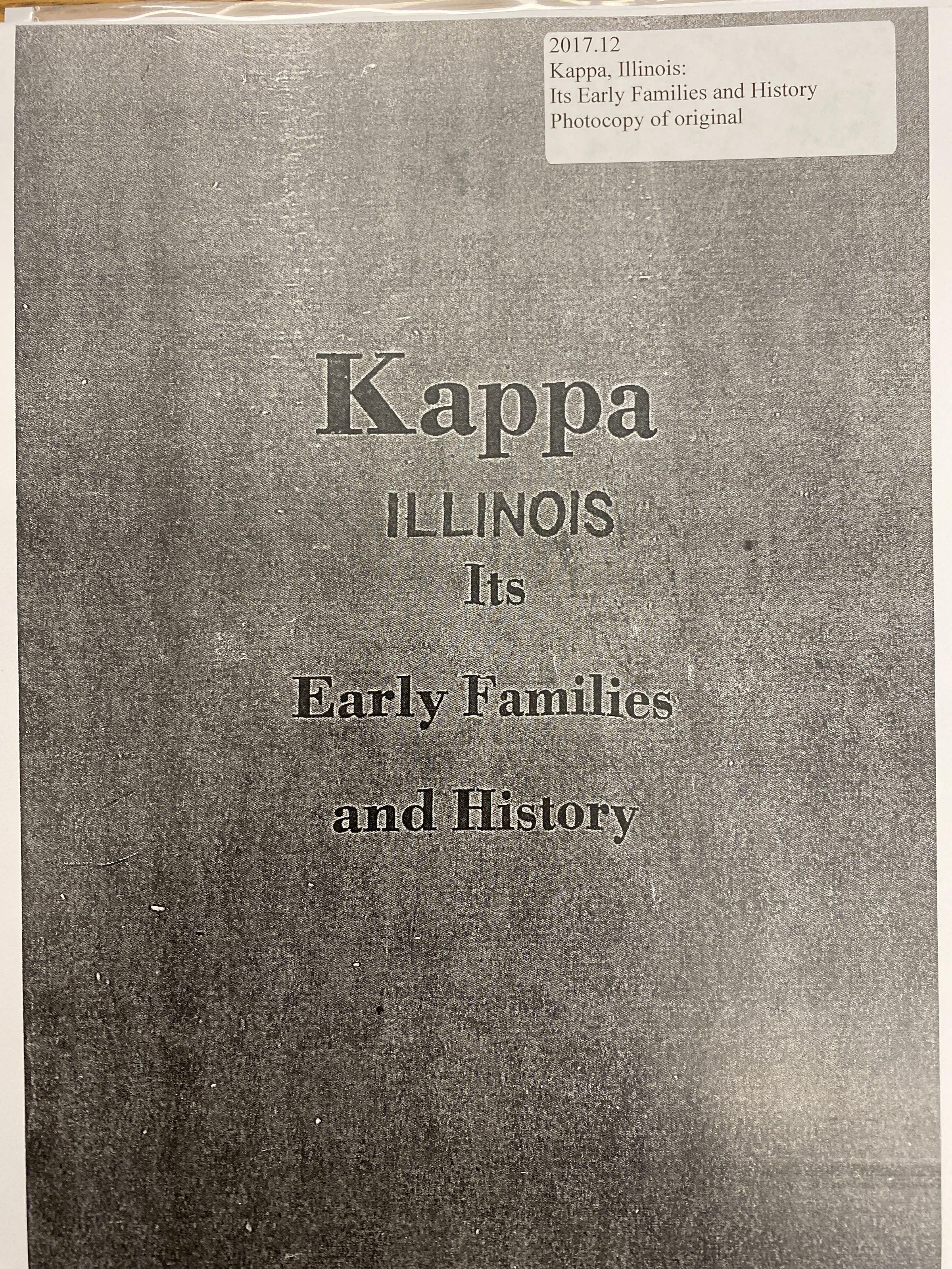 A spiral bound, photocopy of a book published by the Woodford County Historical Society in 1978 on Kappa, Illinois, Its Early Families and History. We were unable to obtain an original copy, so this was copied from one owned by Roy and Joann Sparks of Hudson.