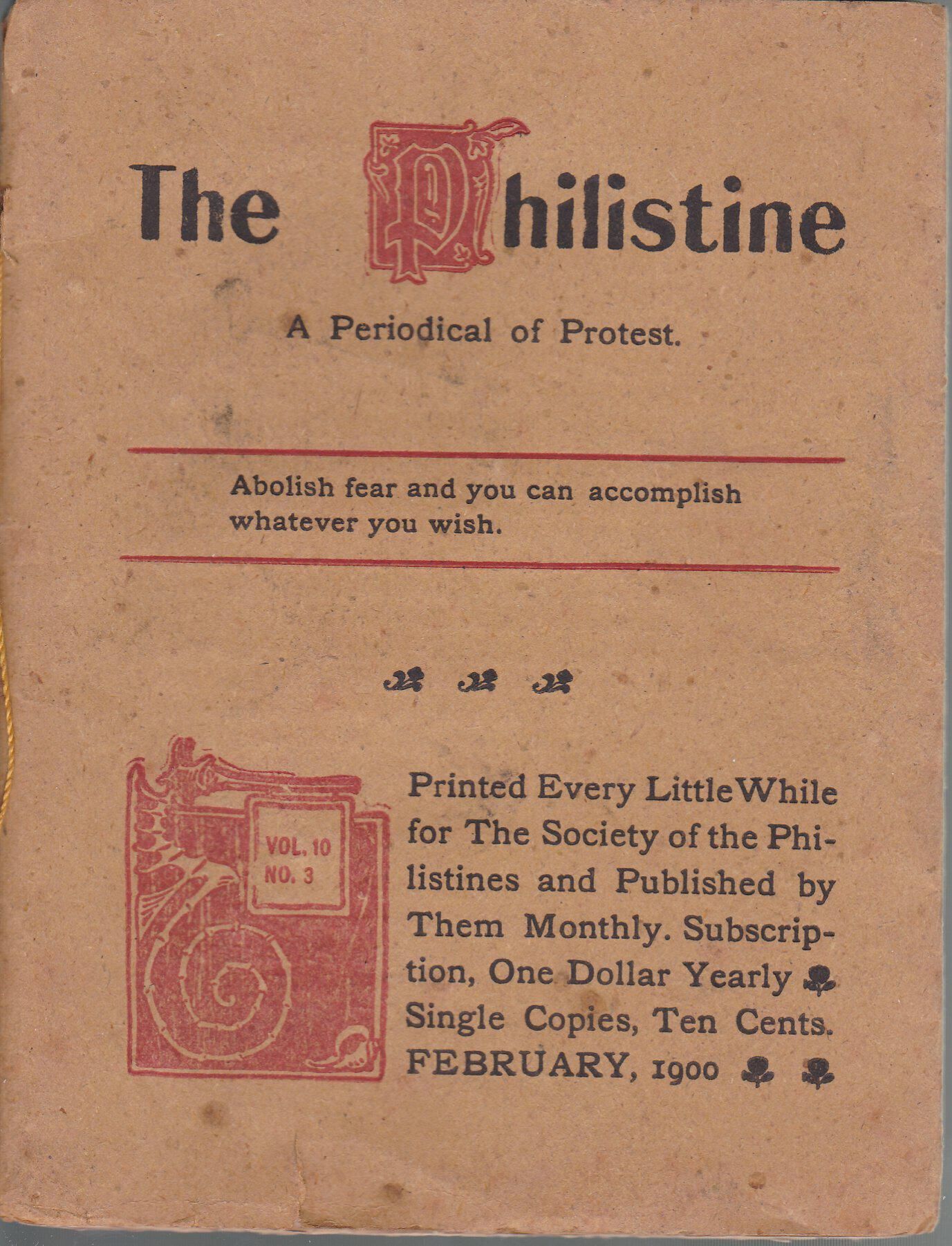 A collection of booklets printed for The Society of the Philistines and published by them monthly. 4 1/2 x 5 3/4 with paper covers. Contained in this set are: February 1900; March 1900; September 1901; June 1903; July 1903; August 1903; September 1903; October 1903; August 1910.