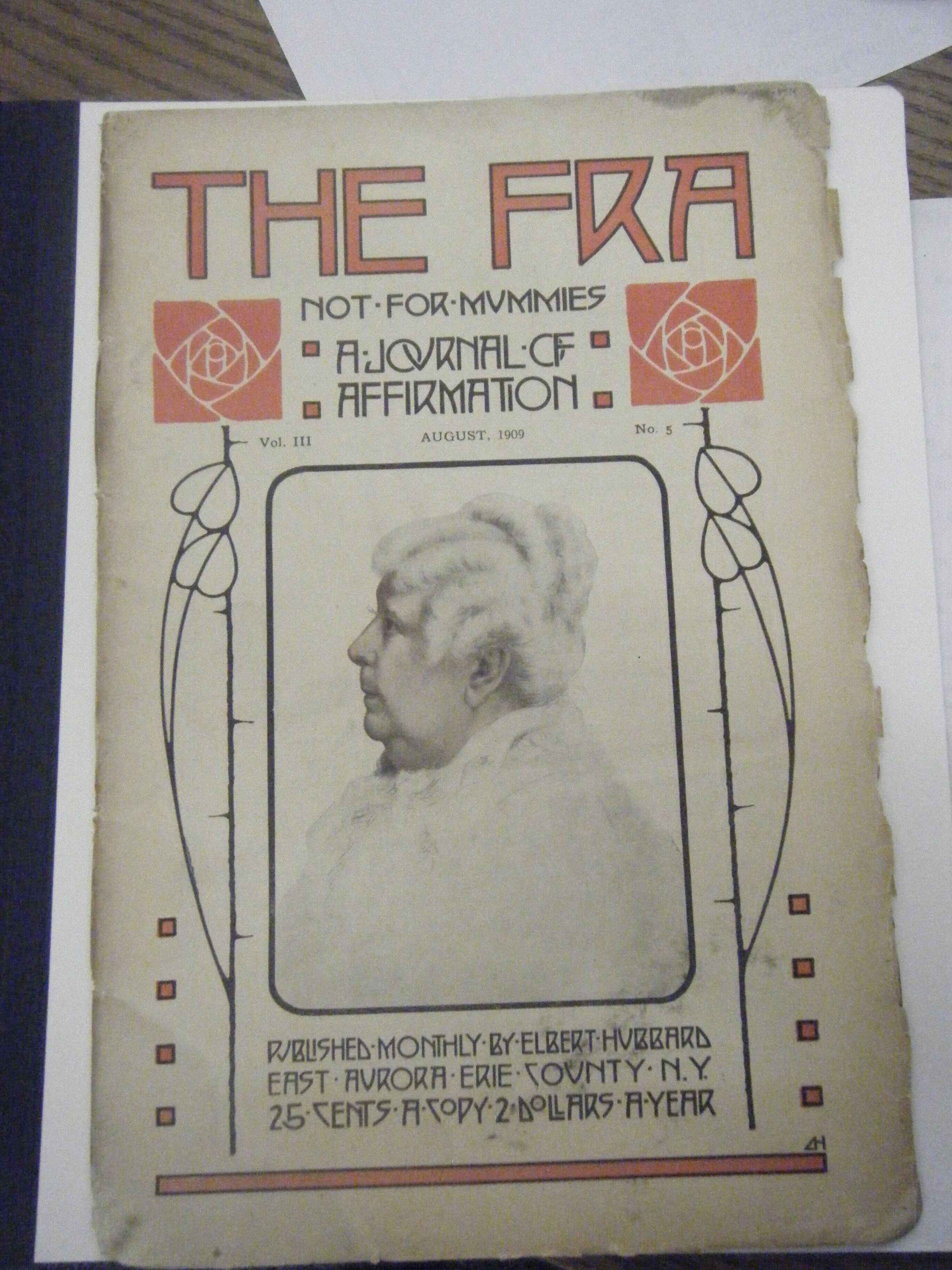 The Fra (Not for Mummies), August, 1908, Vol. 1, No. 5 by Elbert Hubbard. 9 x 14 with paper cover that is frayed at the edges.