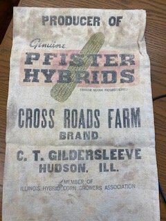 Pfister Hybrids seed corn cloth bag. Marked with 'Cross Roads Farm Brand'. C.T. Gildersleeve, Hudson, Illinois. Member of Illinois Hybrid Corn Growers Association. Cloth bag measures approx 13 X 35 inches. Fairly good shape, some staining and several small holes. Black lettering is good, some red discoloration/fading behind the Pfister Hybrids name.