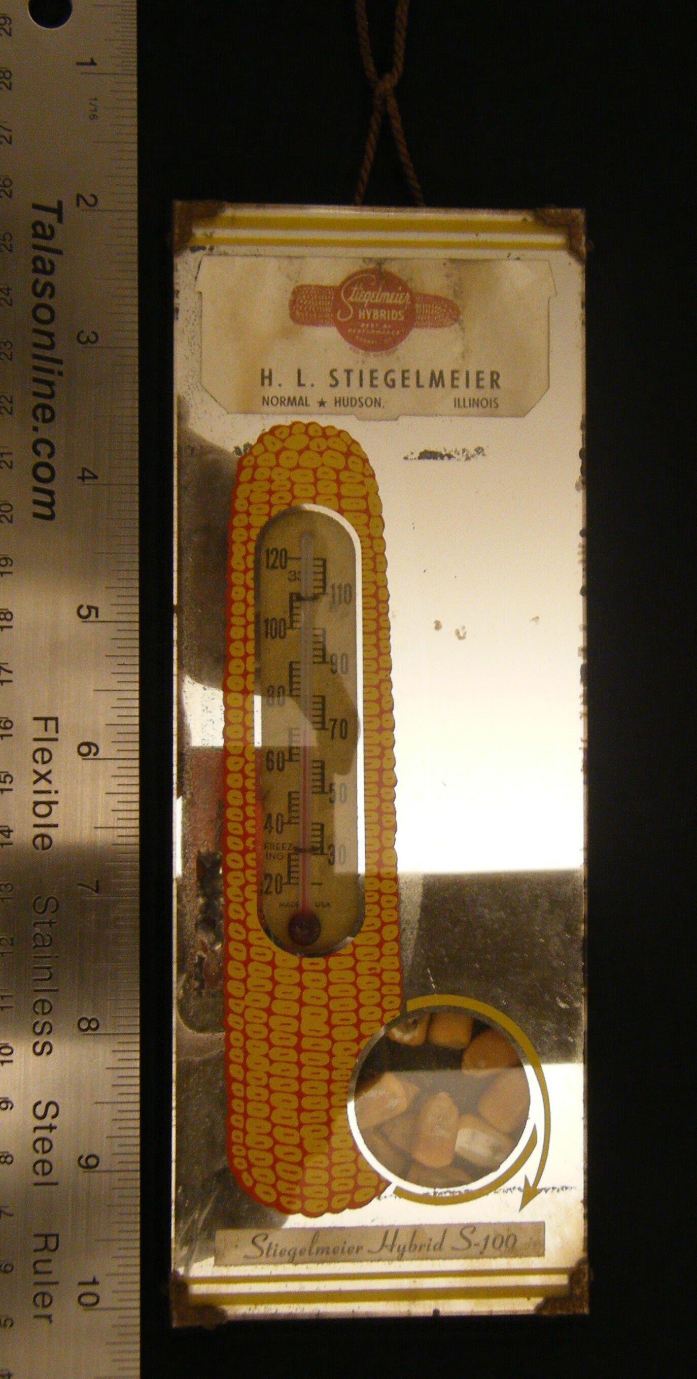Mirrored wall thermometer with encased seed corn sample and corn cob design - H. L. Stiegelmeier, Hudson, IL