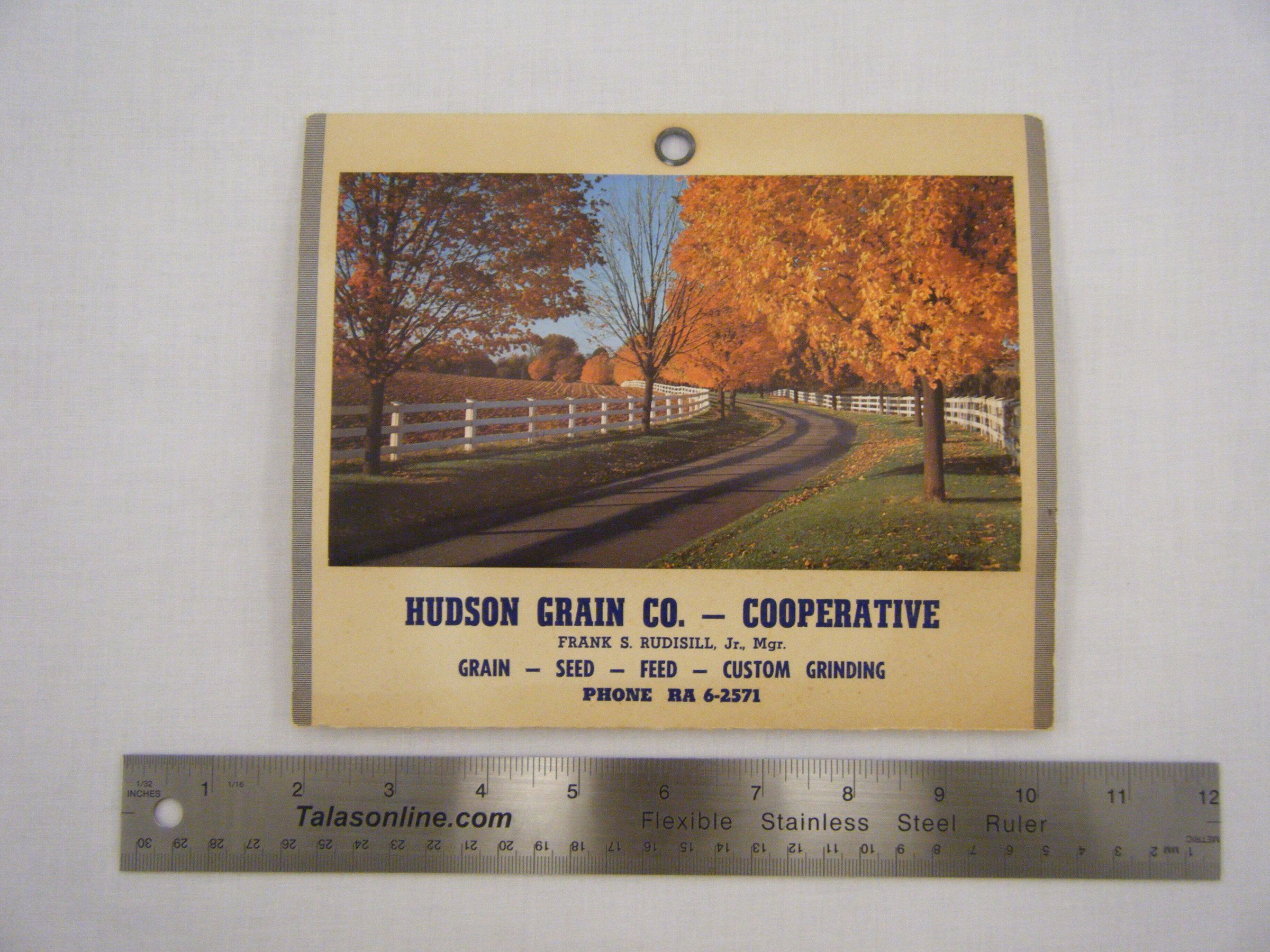 Hudson Grain Co. - Cooperative; Frank S. Rudisill, Jr., Mgr. (Nov 1959 - Sept 1965) Grain-Seed-Feed-Custom Grinding; Phone RA 6-2571; country road fall scene