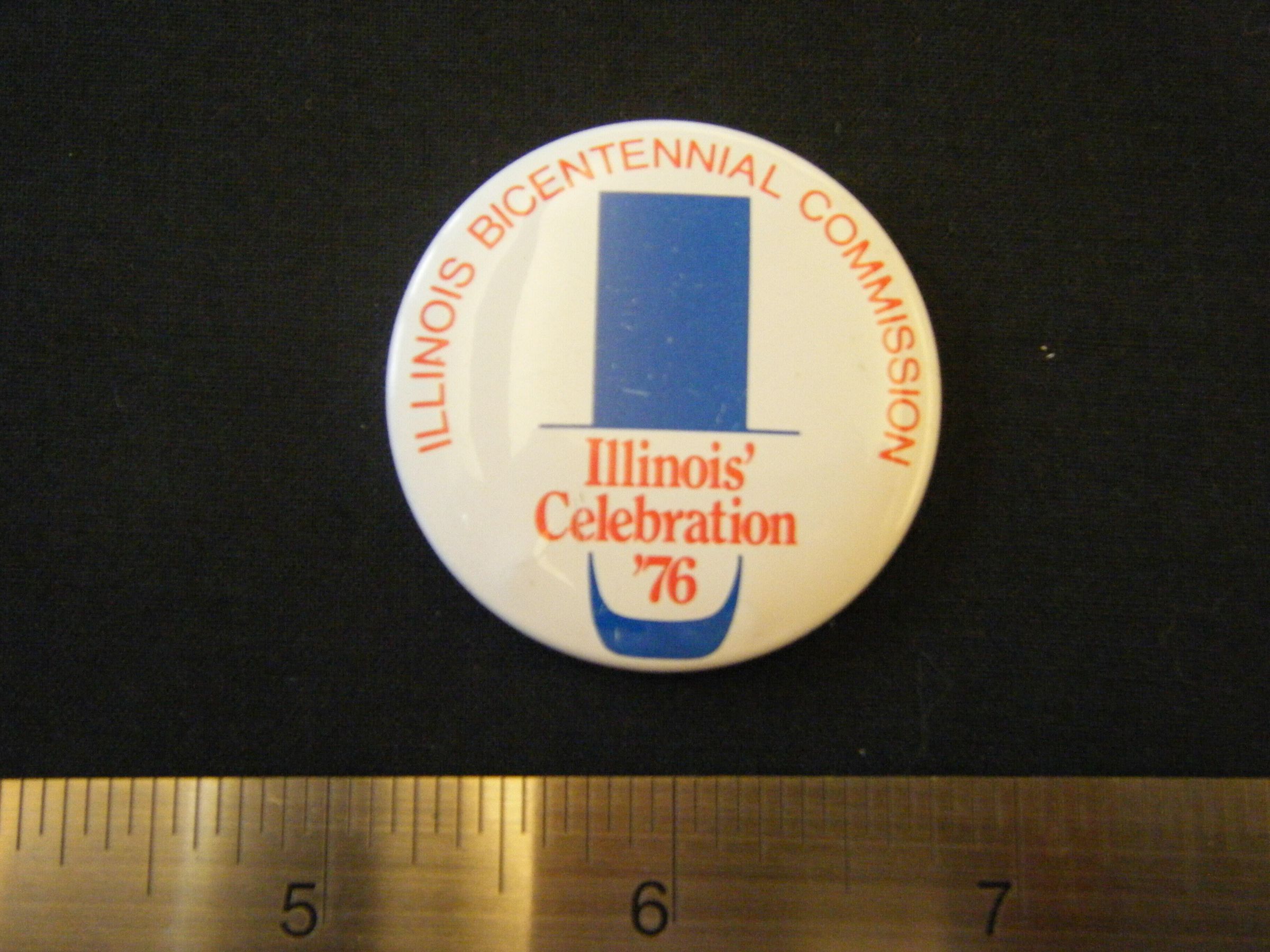 White Illinois Bicentennial Commision Pin with Illinois' Celebration '76 printed between "Abe's) blue stovepipe hat and blue beard.