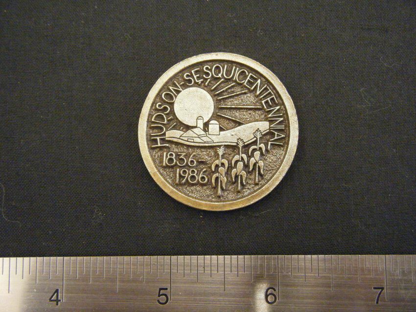 Sesquicentennial Medals with the Hudson, IL logo and slogan. Debbie Whitwood designed the logo; Suzanne Stephens won the slogan contest.