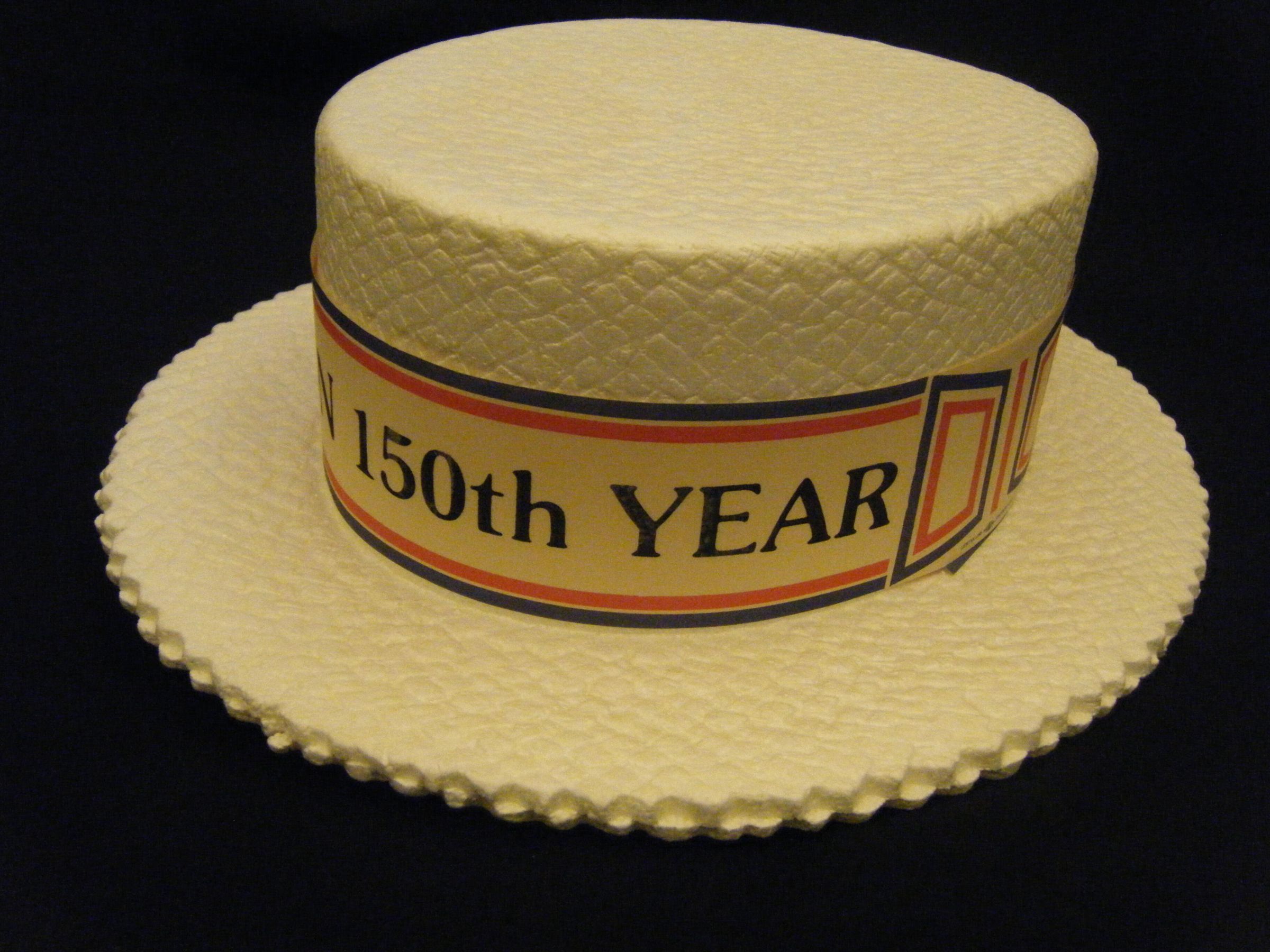 White (straw-like) hat with red, white, and blue band which reads, "Hudson 150th Year"
