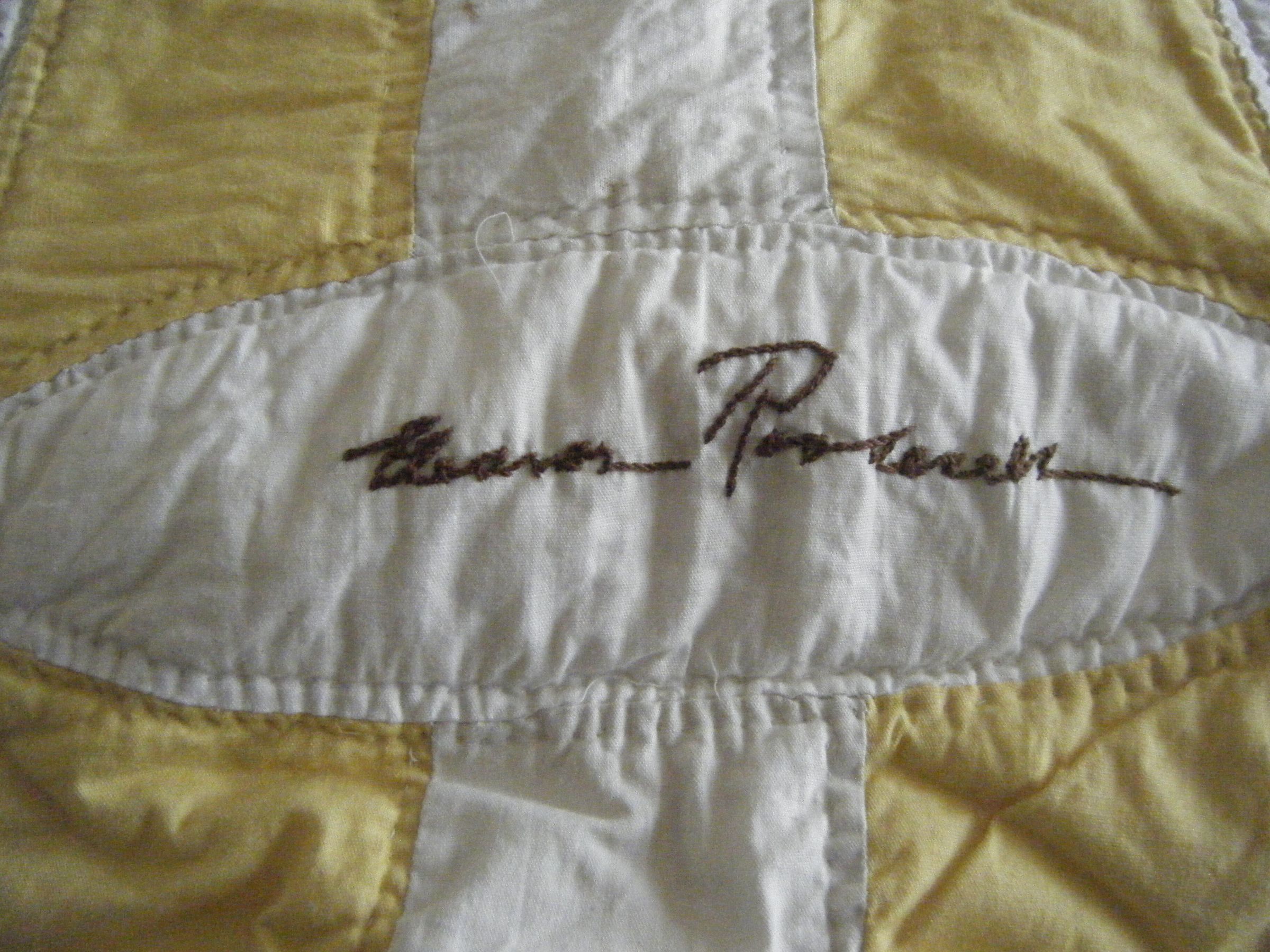 Yellow and white quilt dated 1948 embroidered with the signatures of residents of the Hudson Area as well as those of Eleanor Roosevelt, Bess Truman, and Illinis Governor and Mrs. Adlai Stevenson. The pattern may be a version of the Orange Peal Quilt.