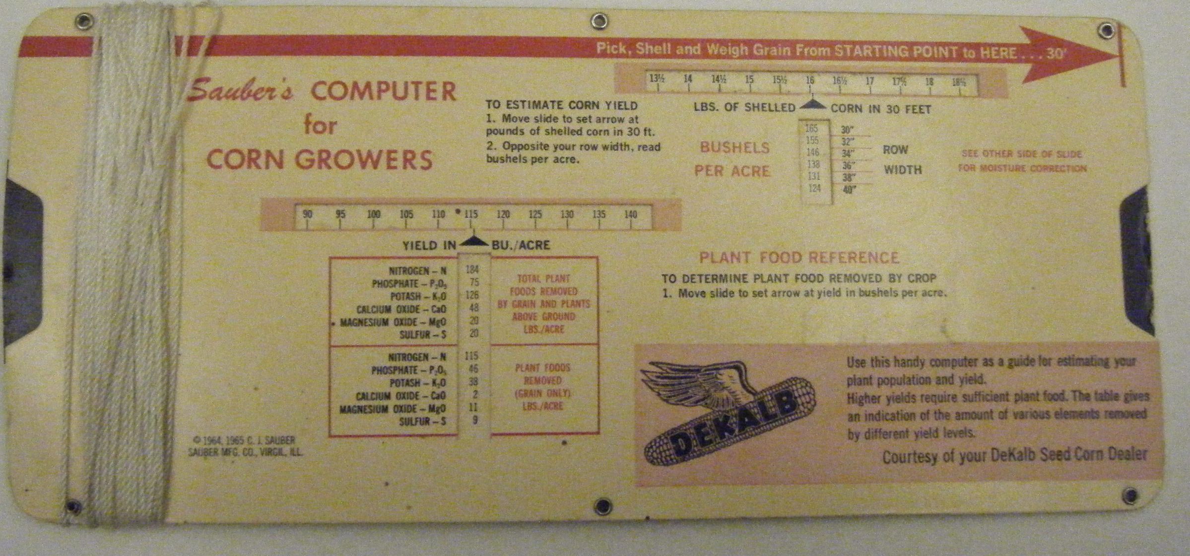 Measuring tool (like a slide rule) for calculating corn yield. Distributed by Dekalb Seed Corn Dealer, L. J. Hinthorn, Hudson, IL