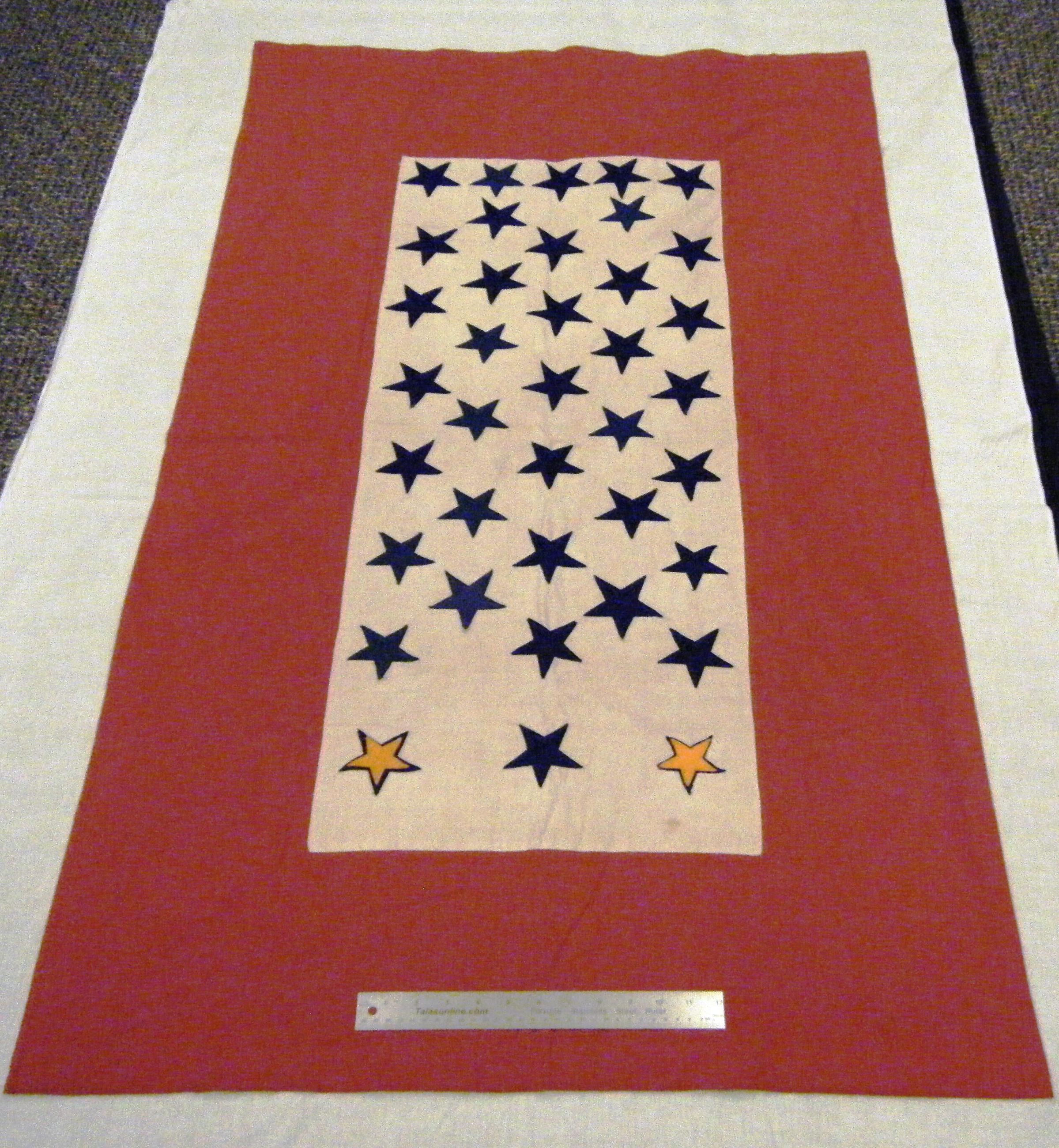 Service flag -- stars (cut out felt) sewn onto red cotton commemorating military men (possibly friends or family members) of Hudson, IL.
