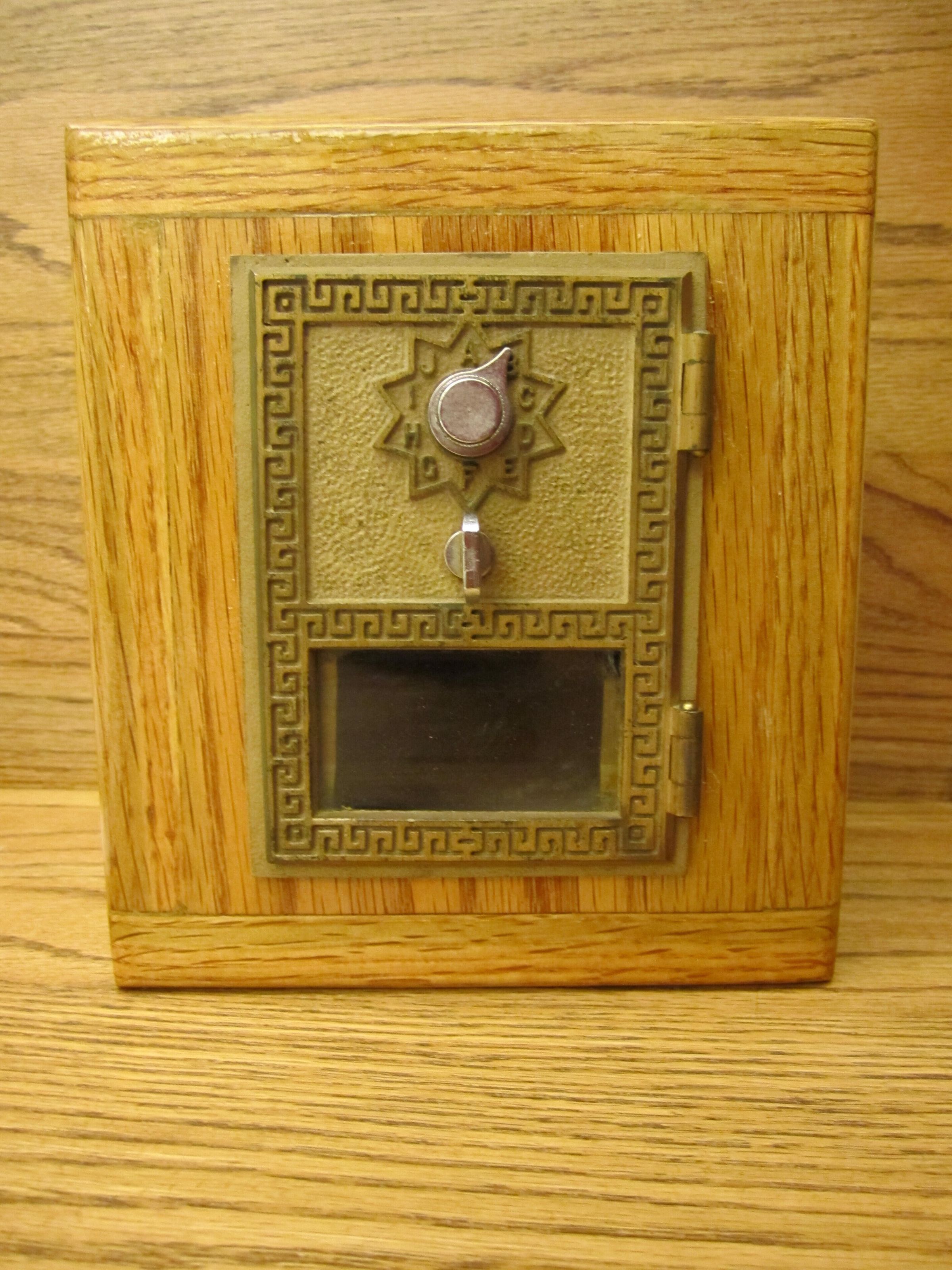 Antique solid brass safe-type post office box from the Hudson Post Office. New, keyed-lock boxes were later installed -- date unknown. No street delivery was available, everyone was required to come to the post office for their mail.