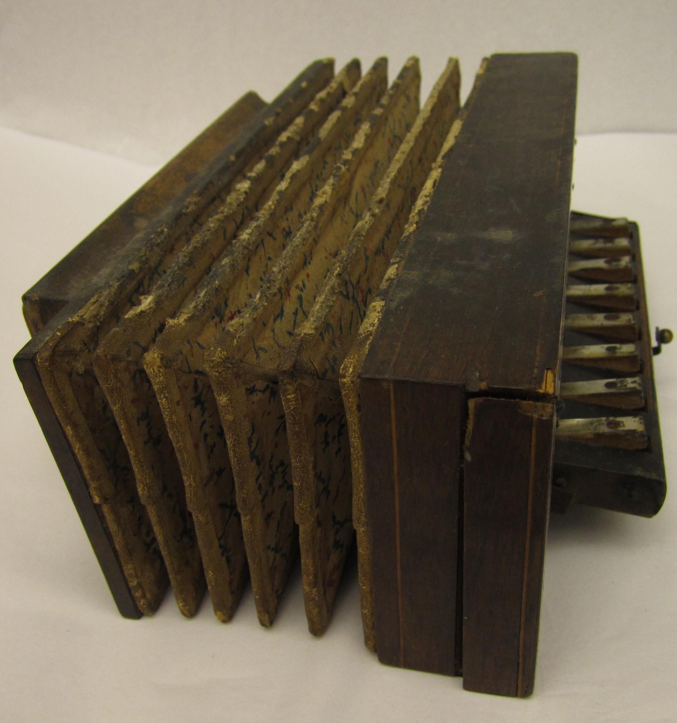 Rectangular wooden squeezebox (concertina) with eight ivory keys. Possibly from the late 1850s.
