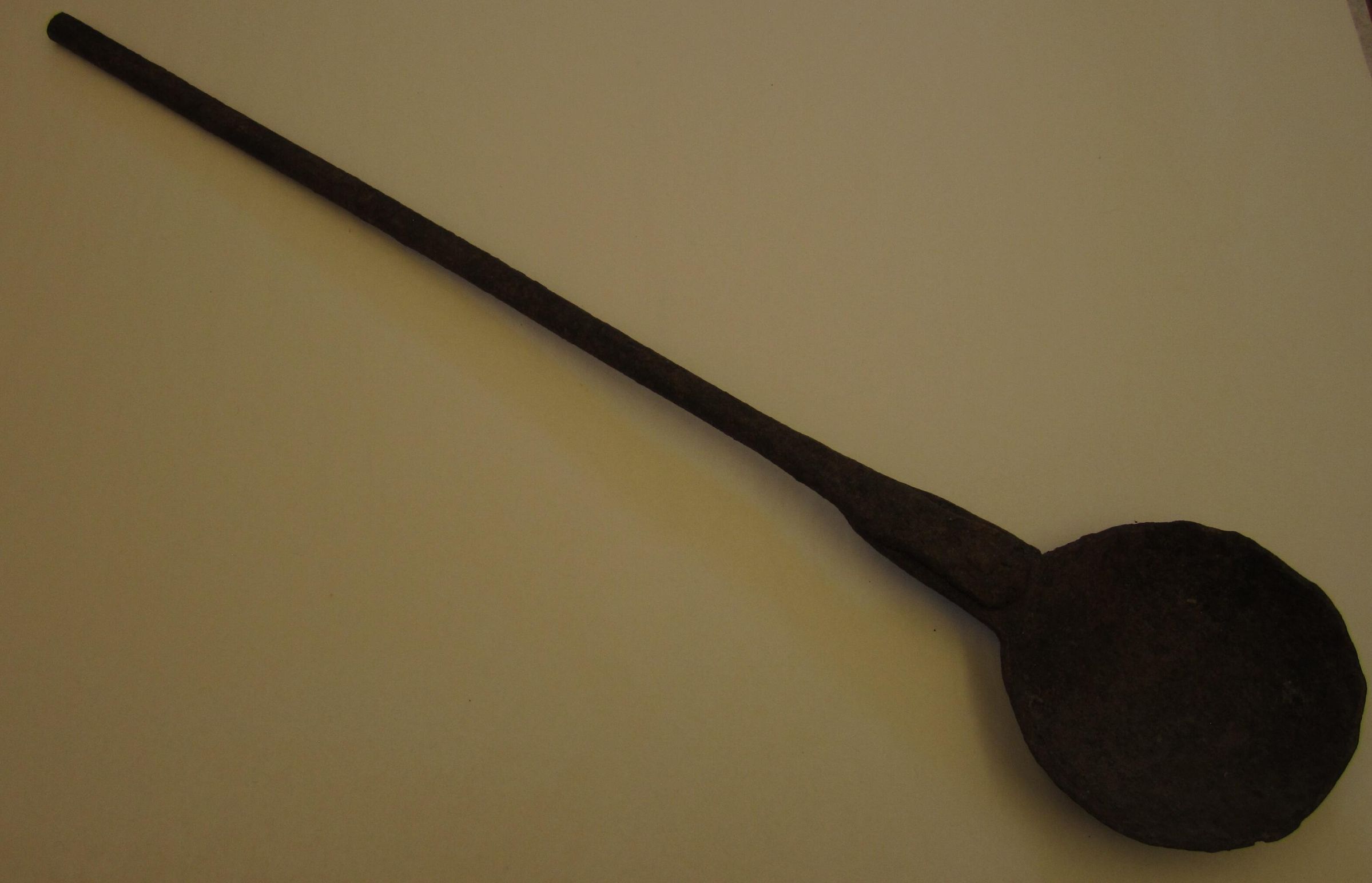 Handwrought iron ladle for use at the fireplace. An accompanying handwritten note from Mrs. Grace Sealey Smith reads, "Small handwrought tongs used by "my pioneers." It is assumed that the ladle is also of the same period. The pioneers mentioned were probably Alfred S. and Phoebe Eliza Weeks who came to Hudson in 1850. Richard Weeks, Alfred's father, bought shares in the Hudson Colony when it was first organized by Horatio Pettit in 1836.