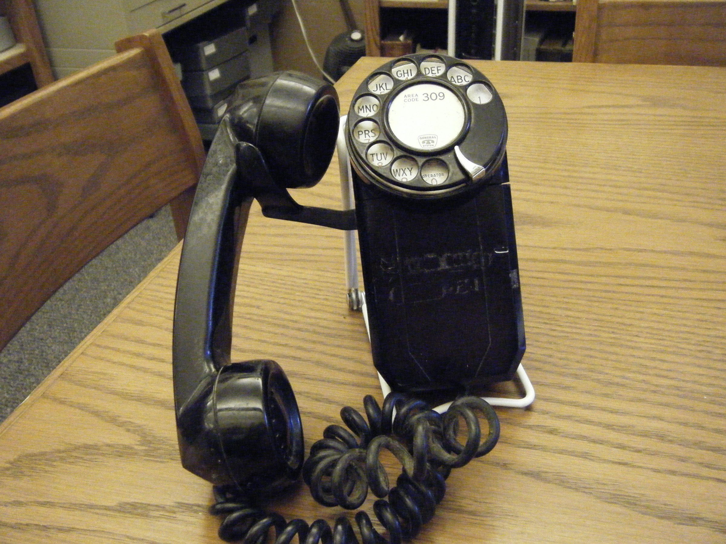Beige desk style telephone, believed to be from the 1950's. Rotary dial.