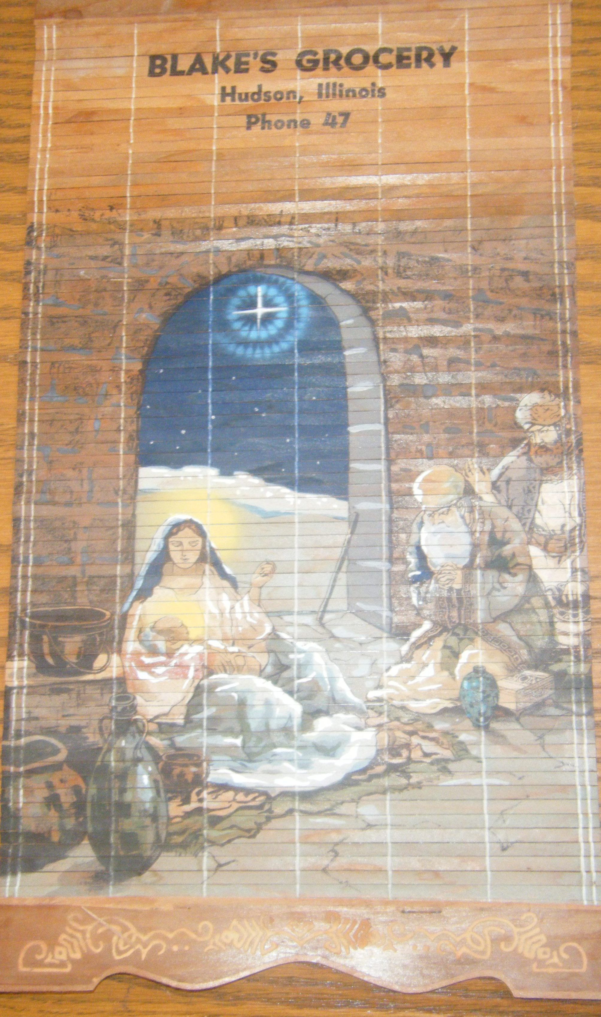 8 x 14 1/2 inches, top of calendar decpicting manger scene was given as a gift to customers by Blake's Grocery. The Paul Blake family operated a grocery store from the late 1940's to the late 1950's. It was located where the current Sit 'n Bull bar is now located. Paint on thin strips of wood.