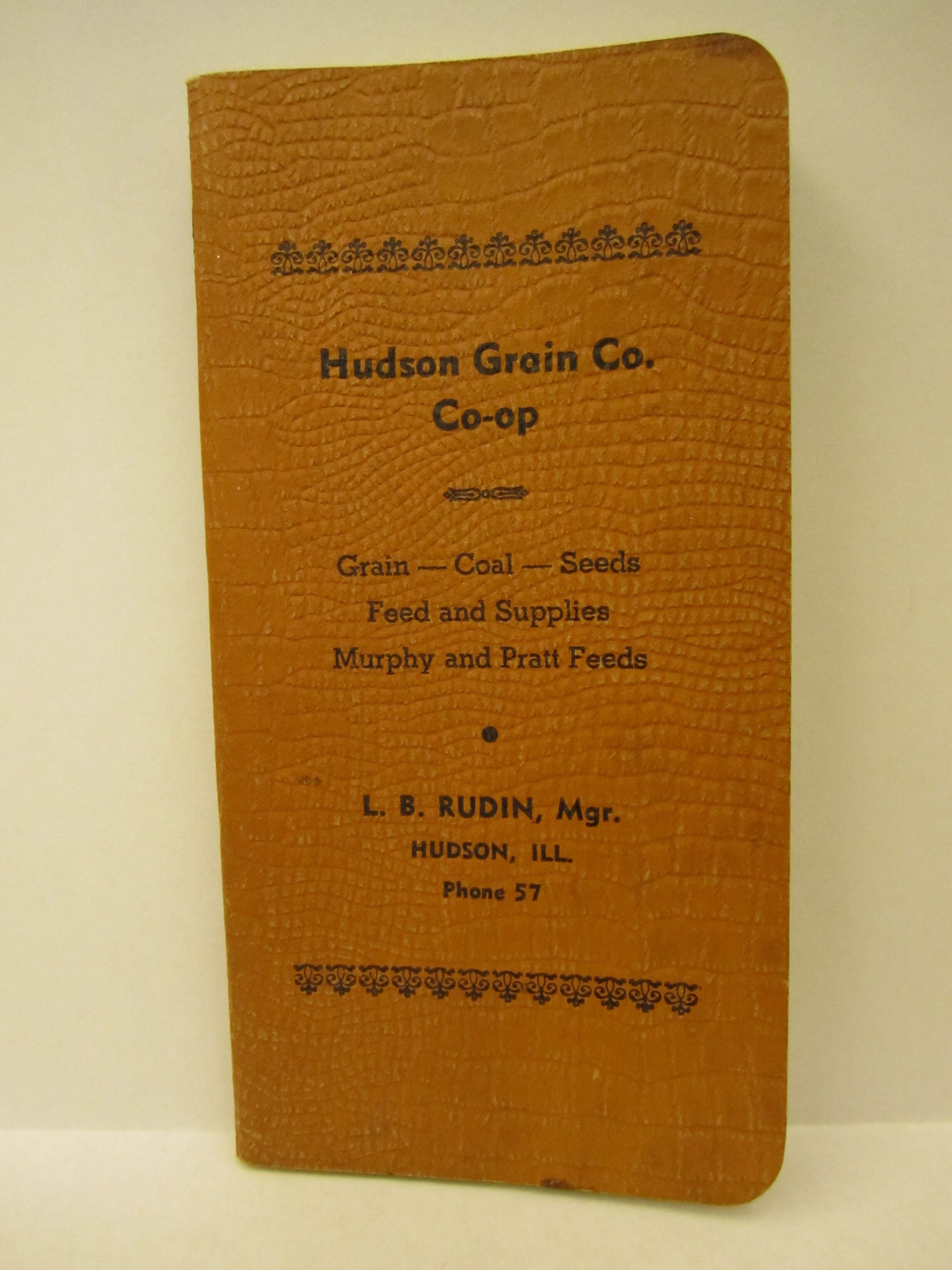 Pocket notebook that includes a Ready Reference Book for Ranchers, Farmers. L. B. Rudin, Mgr. Hudson, ILL Phone 57 is imprinted on the notebook.