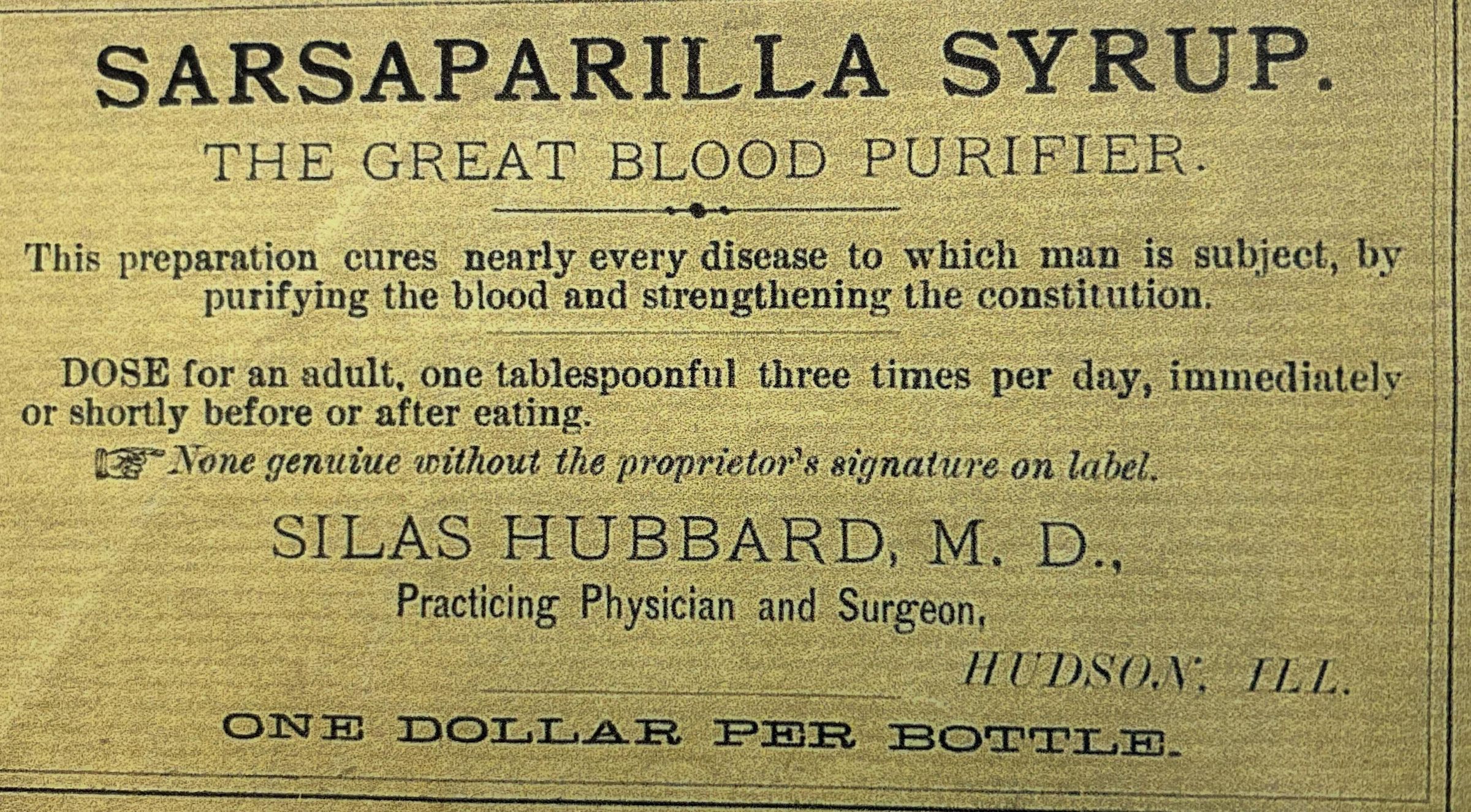 A label from a bottle of Sarsaparilla Syrup - the Great Blood Purifier contocted and sold for $1 per bottle by Dr. Silas Hubbard, Hudson, Ill.