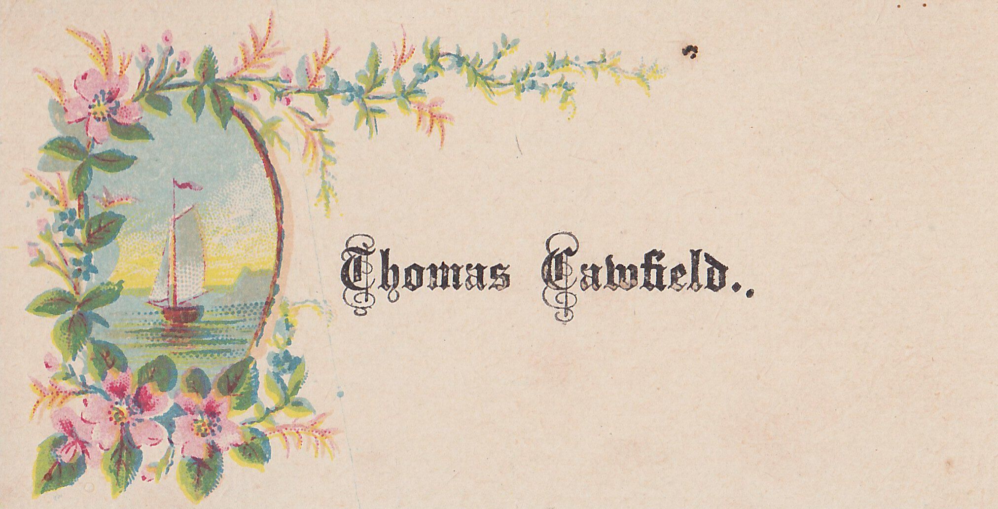 Calling card -- visiting card is a small paper card with a person's name printed on it. Various forms of etiquette governed it's use. Precursor to the business card of today.