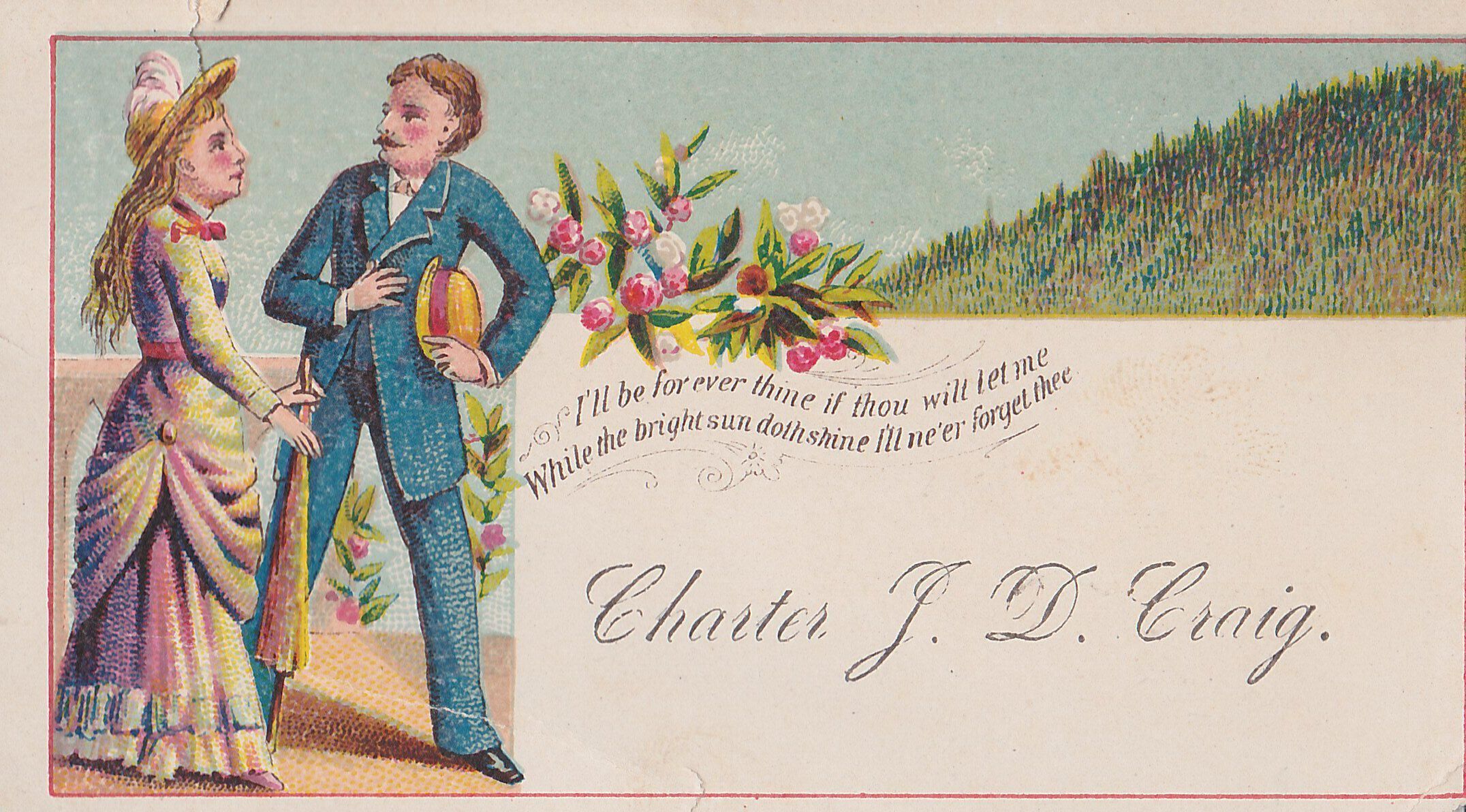 Calling card -- visiting card is a small paper card with a person's name printed on it. Various forms of etiquette governed it's use. Precursor to the business card of today.