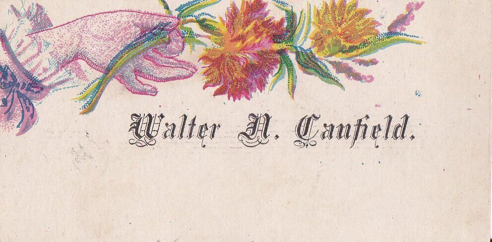 Calling card -- visiting card is a small paper card with a person's name printed on it. Various forms of etiquette governed it's use. Precursor to the business card of today.