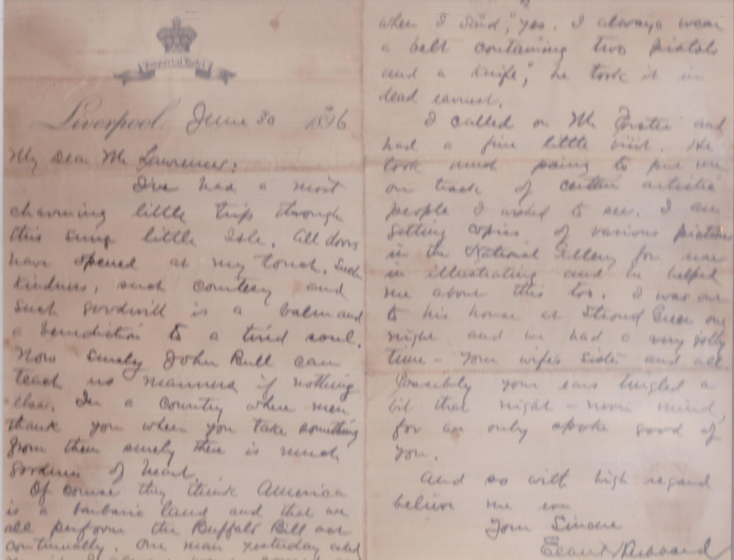 Handwritten letter from Elbert Hubbard sent to Mr. and Mrs. William Lawrence from Liverpool, England in 1896. Copy on display in the History Room. Top shelf of Hubbard Bookshelves.