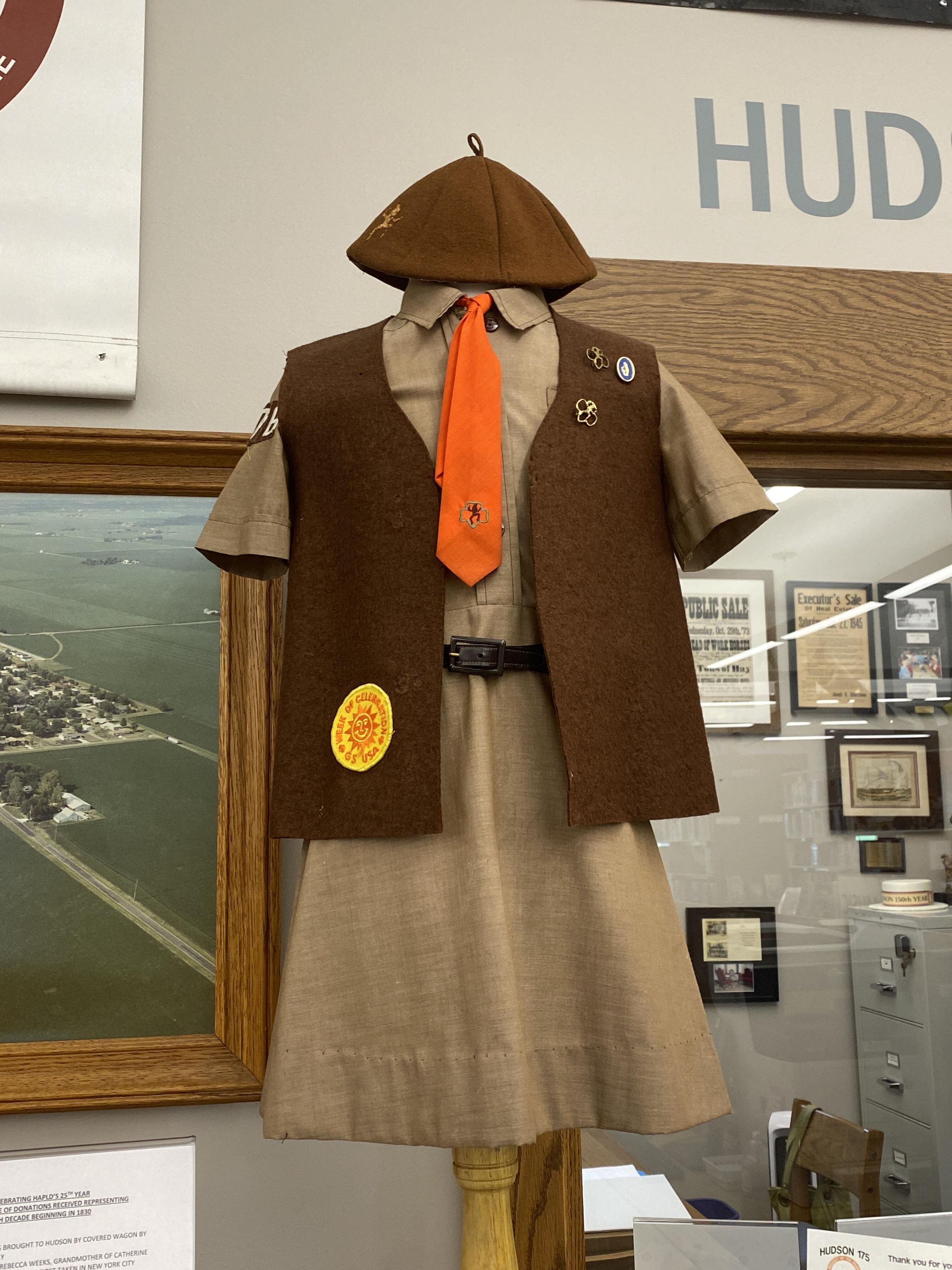Girl Scout Uniform including vest, hat, tie, dress, belt, and pocket book