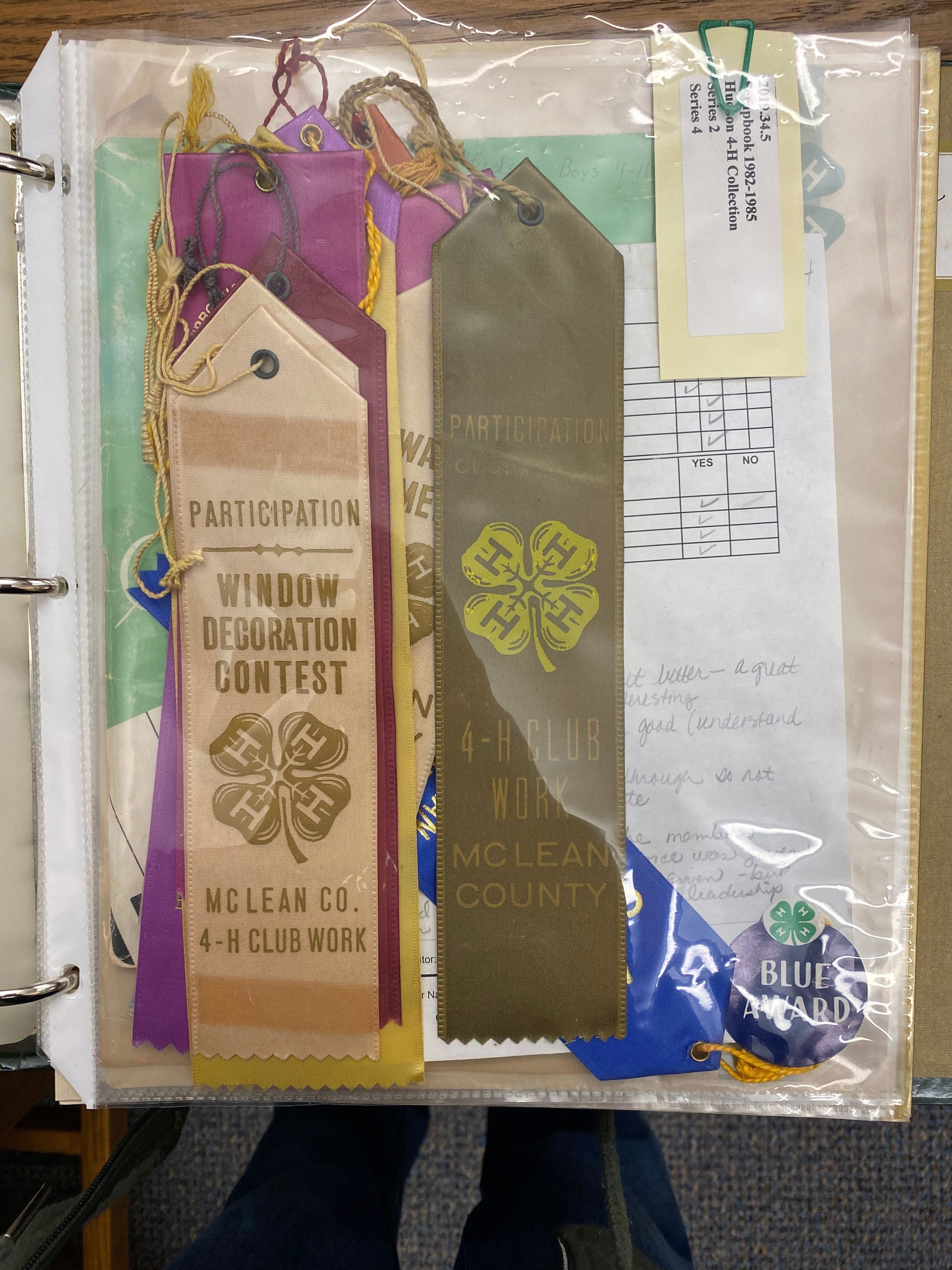 Green and gold scrapbook with magnetic photo pages containing newspaper clippings, award ribbons, and other documents.