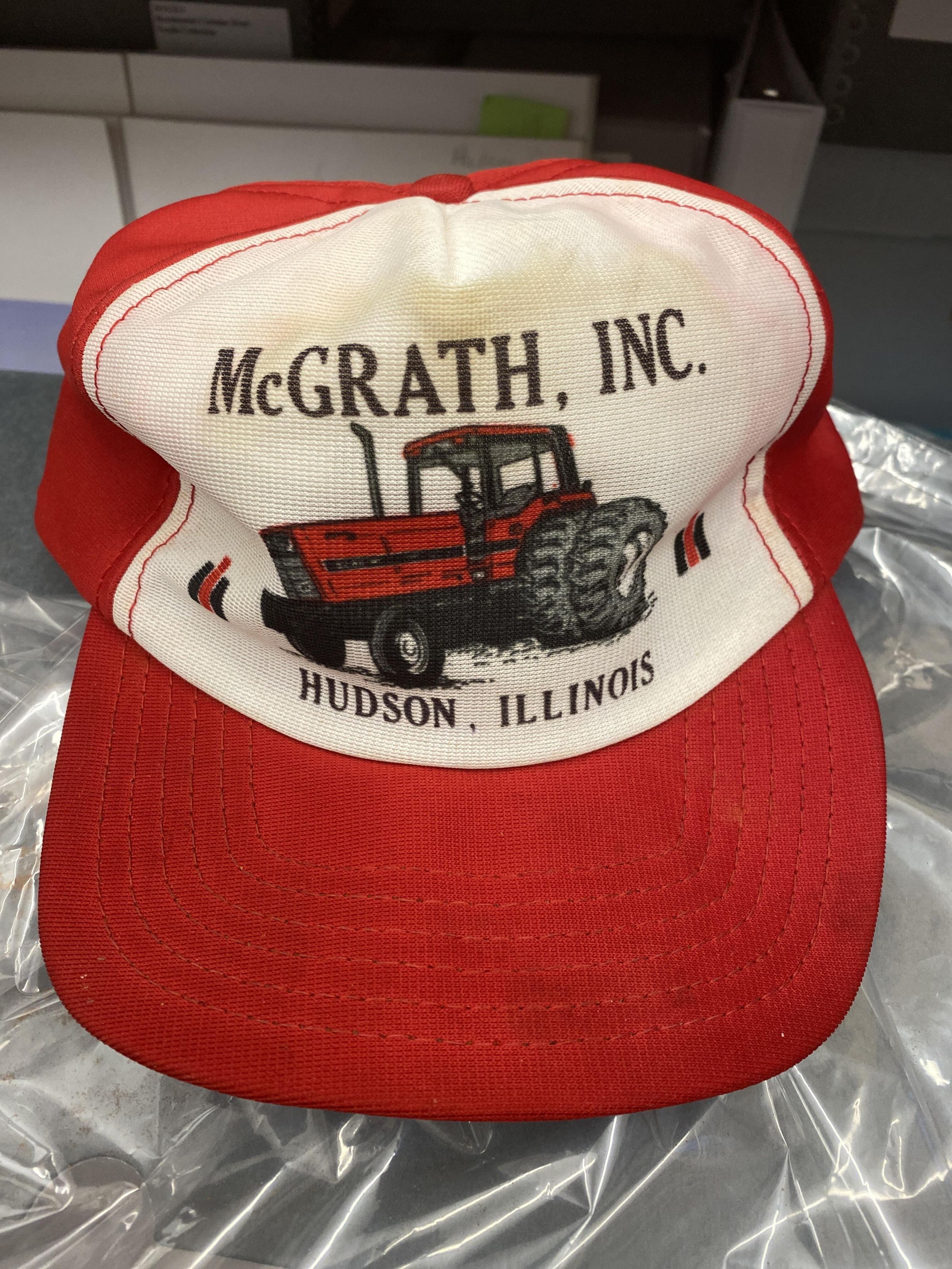 McGrath, Inc. Hudson, Illinois Red & white trucker hat with image of a tractor on the front for the Hudson Implement Store
