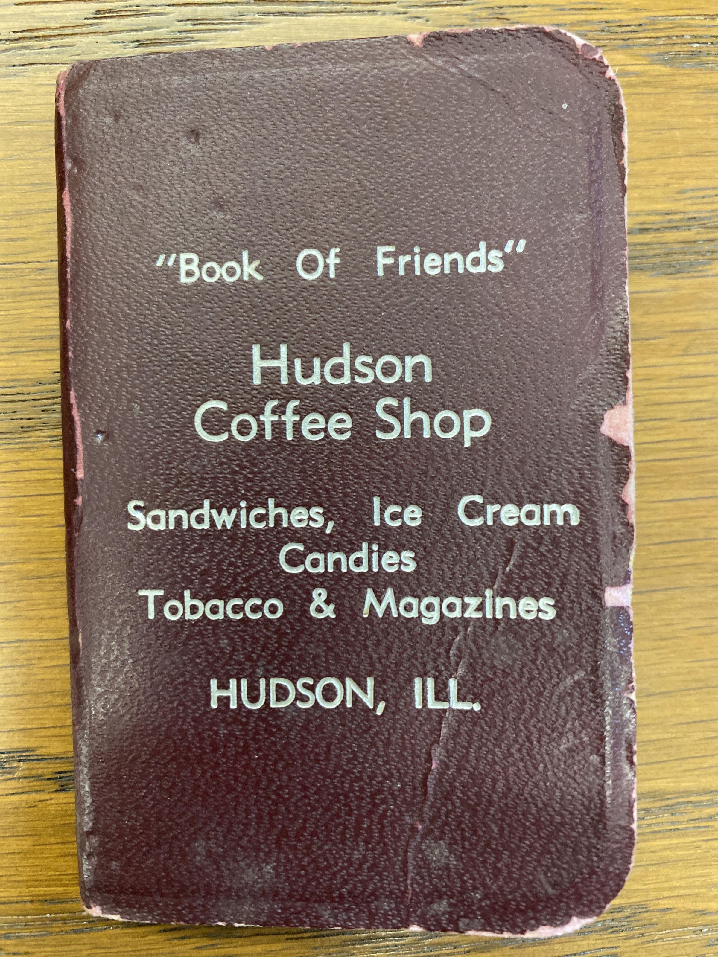 "Book of Friends" Hudson Coffee Shop, Hudson, Illinois. Small 2 X 3 1/4 address book. Calendar inside front and back covers 1954 - 1955.