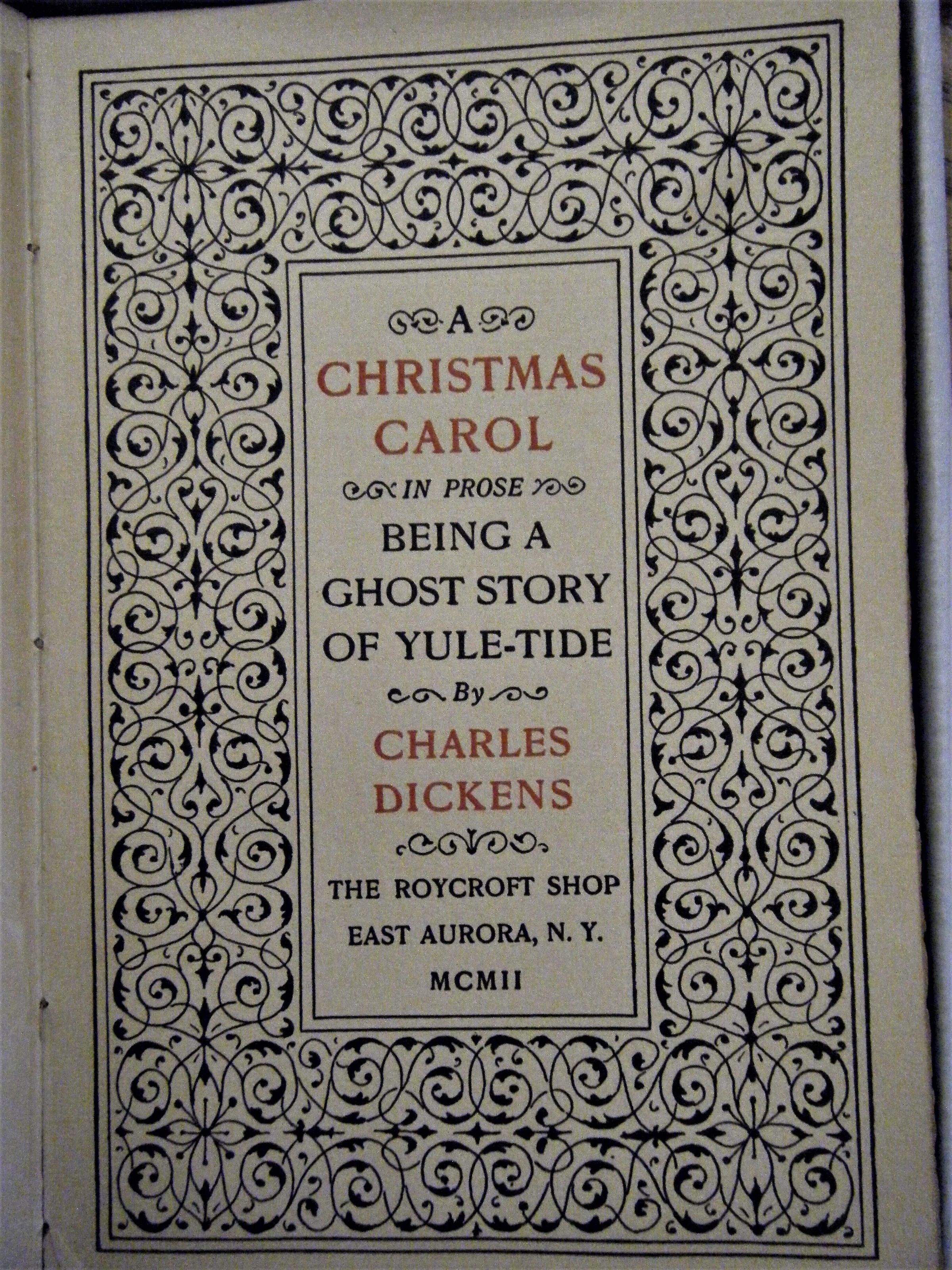 Suede bound book, "A Christmas Carol" in prose, being a Ghost Story of Yule-Tide -- Copyrighted by Elbert Hubbard, published by the Roycroft Shop, East Aurora, NY. Suede bound , 6 1/4 x 9 1/4" p. 141