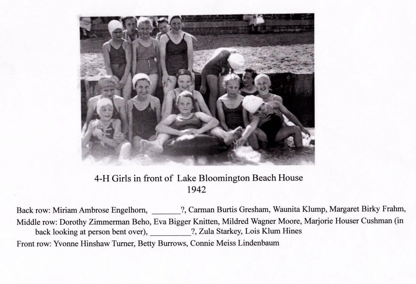 4-H Girls in front of Lake Bloomington Beach House 1942. Additional information and photographs can be found in the Hudson History Room of the Hudson Area Public Library.