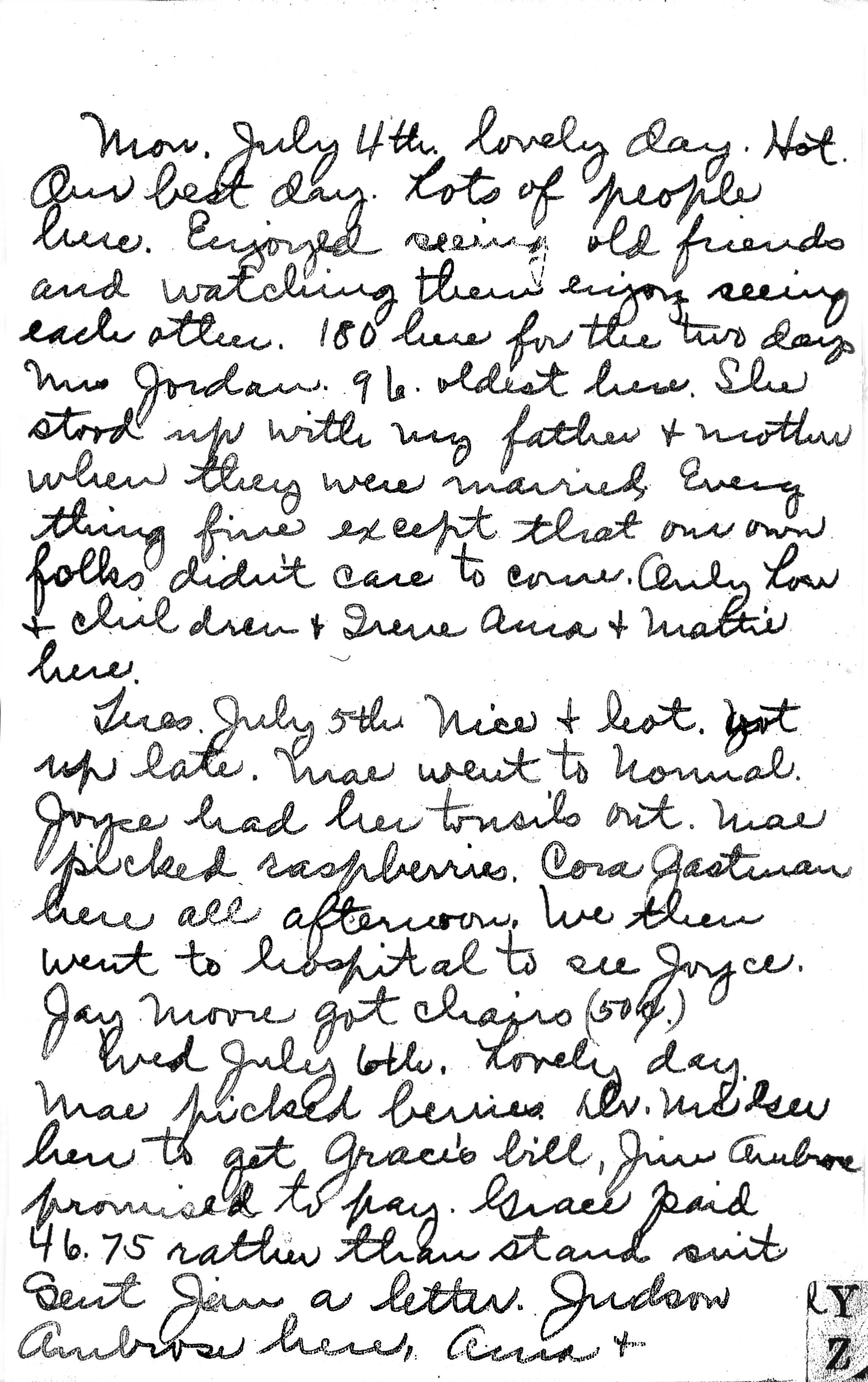 A copy of the Johnston sisters Diary from 1937 to 1938 on July 3 and July 4th. The sisters names are Lora, Mae and Grace.