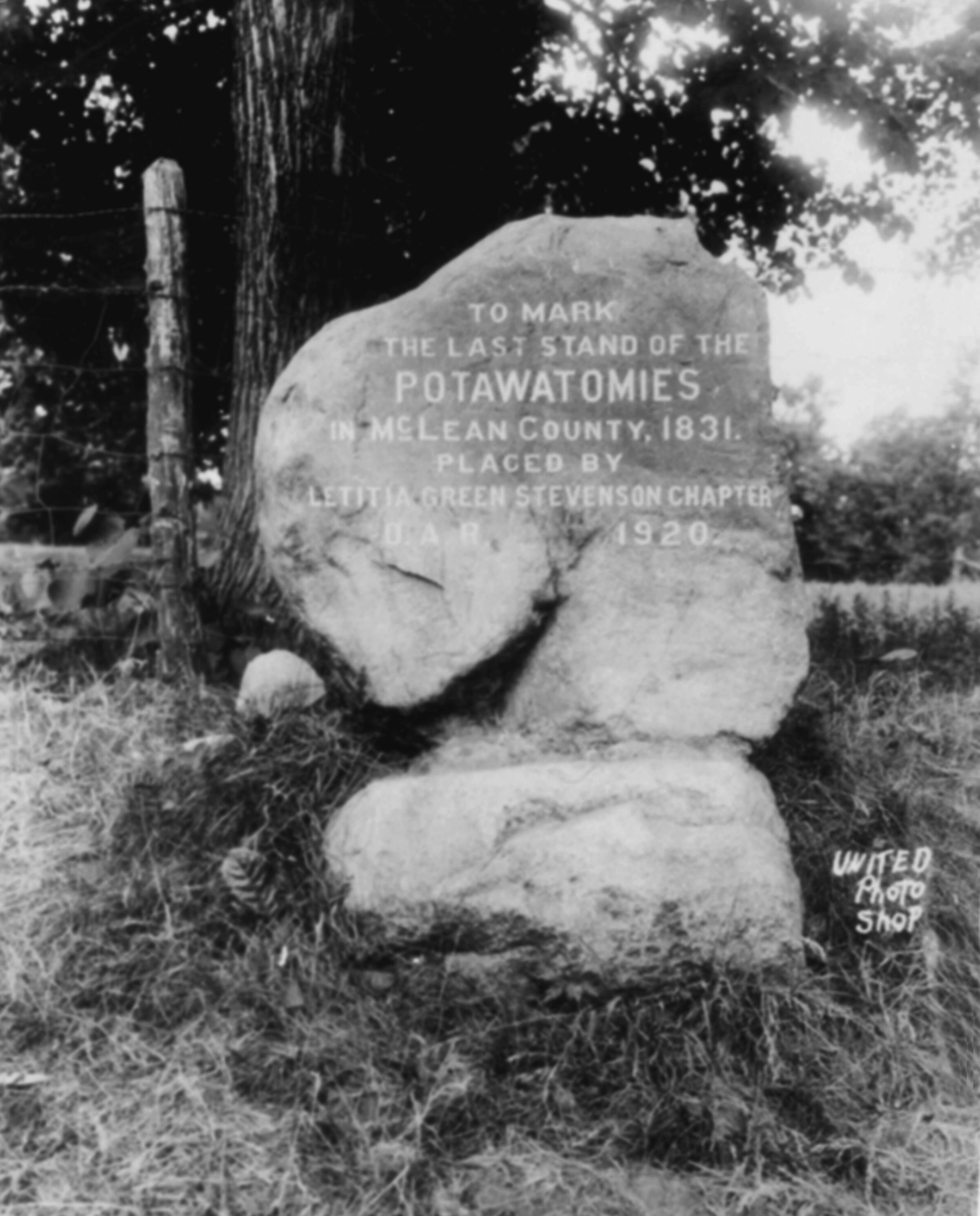 A Photograph of the Potawatomi memorial. The memorial was placed near Six Mile Creek by the Letitia Green Stevenson Chapter of the Daughters of the American Revolution but was later moved to Hudson's Veterans Park.