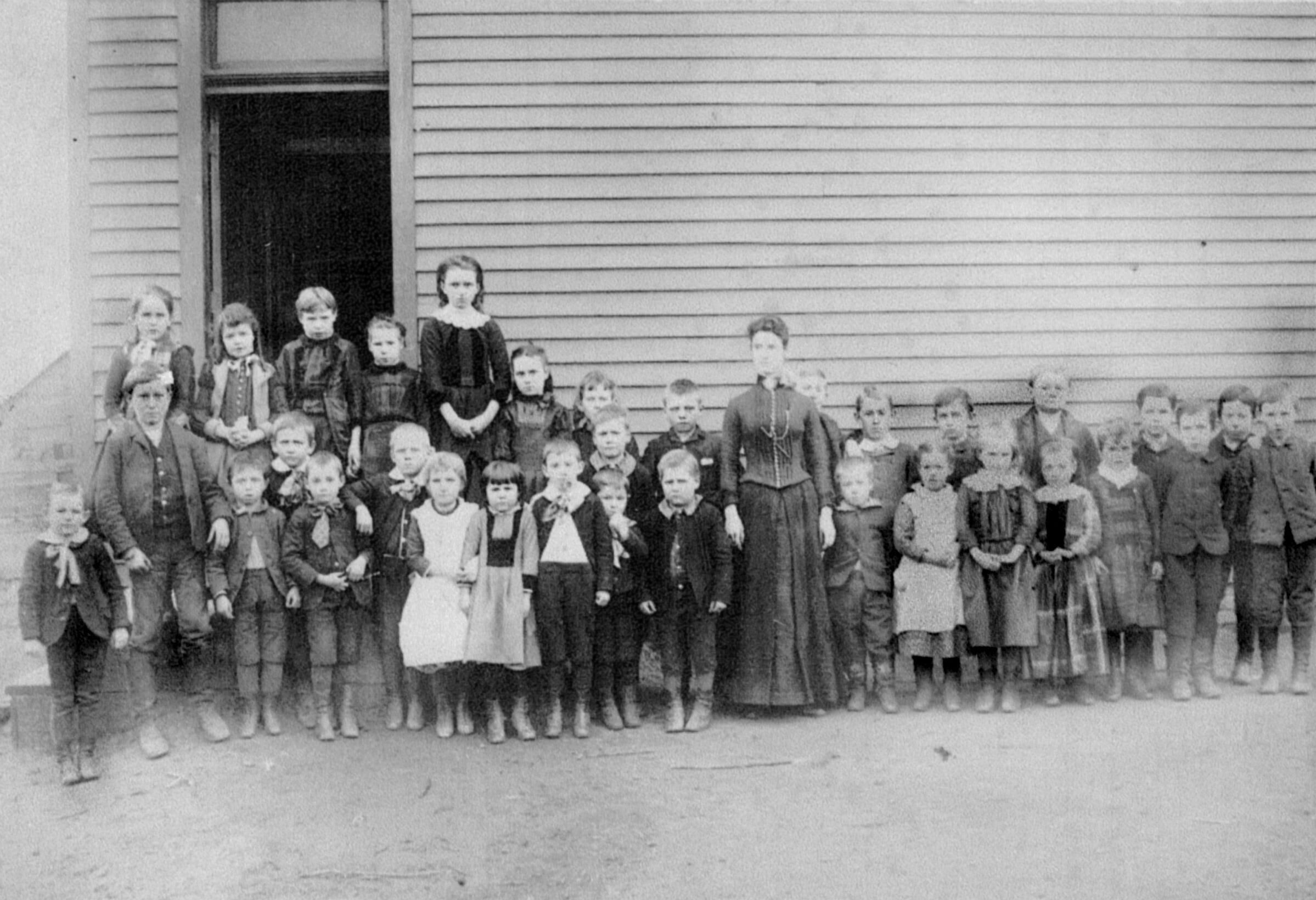 Photograph of students outside the second Hudson Schoolhouse in the late 1875. The school was adjacent to East Cemetery -- later named Hudson Cemetery. Some families that attended the school were Ambrose, Burtis, Cox, Gazelle, Skinner, Hasenwinkle, Hamm, and Hinthorn.