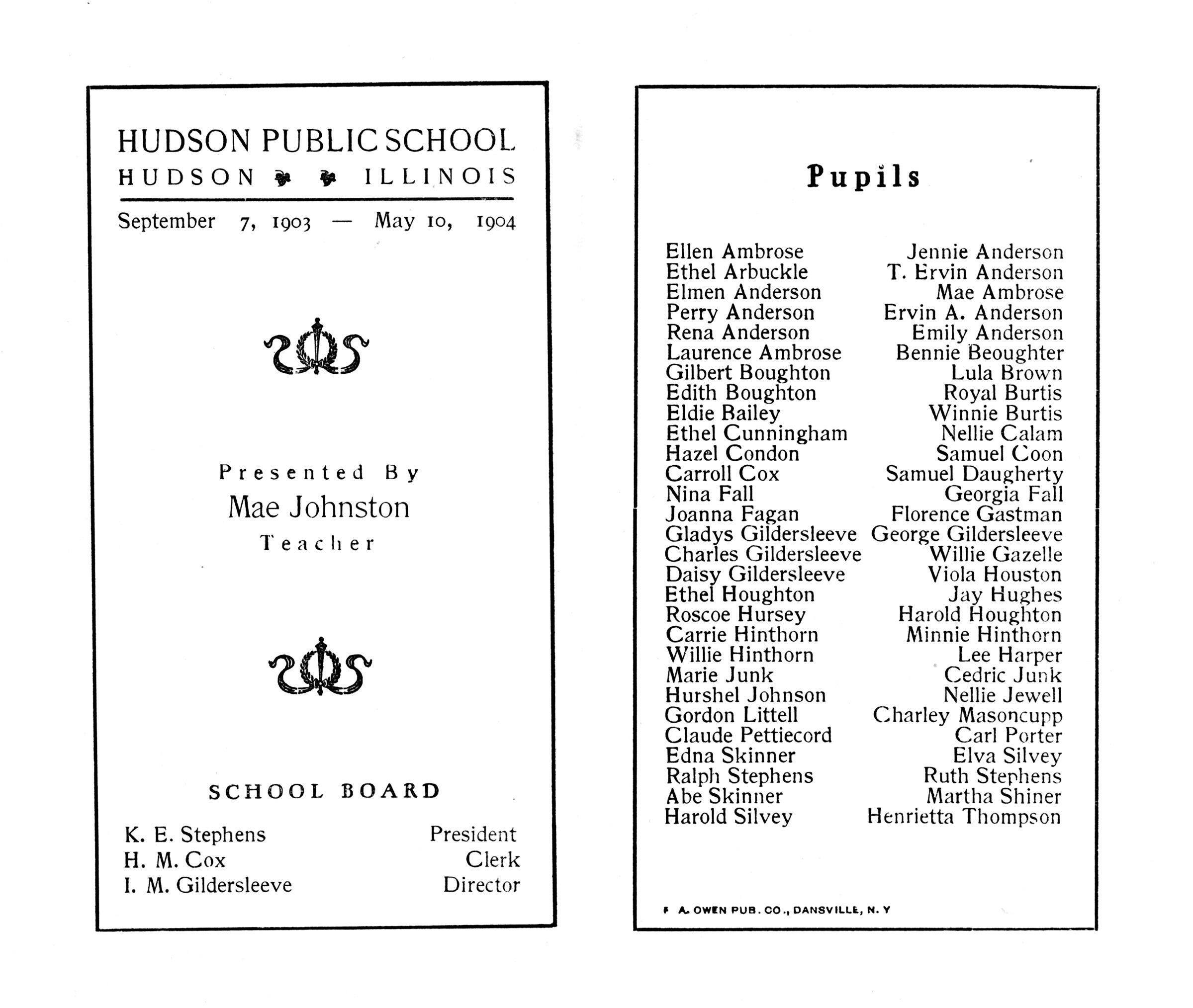 Each student of Hudson School was given a souvenir booklet by their teacher at the end of the year listing names of students and of the school board.
