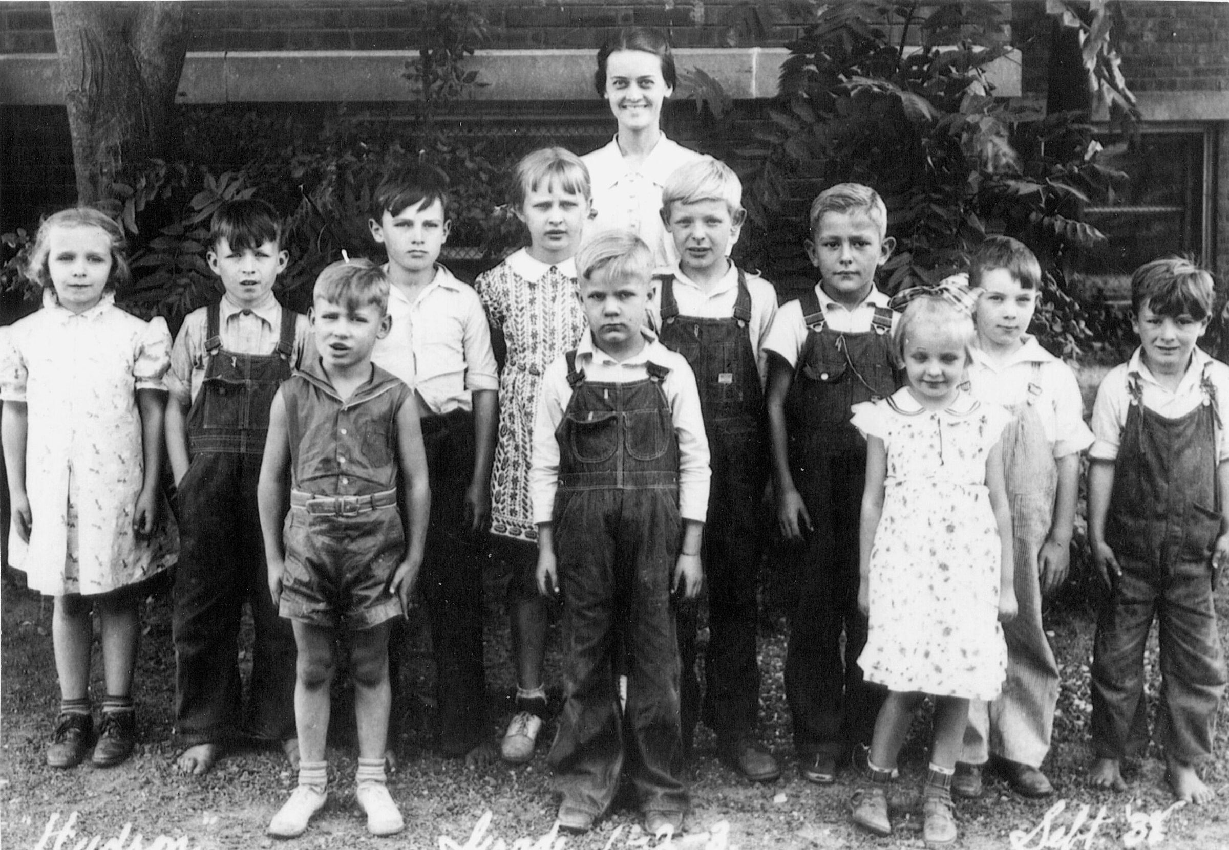 Hudson school students from grade one, two, and three in September 1938. Some students in the picture left to right: Mary Ann Boggs, Russell Bigger, John Ellison?, Milford Arbuckle, Carman Burtis, Jimmie (James)Vandegraft, Clifton Arbuckle, Darrell Baker, Delores Ramsey, Harold Siegworth, and Eddie Arbuckle. The teacher was Miss Ina Brown.