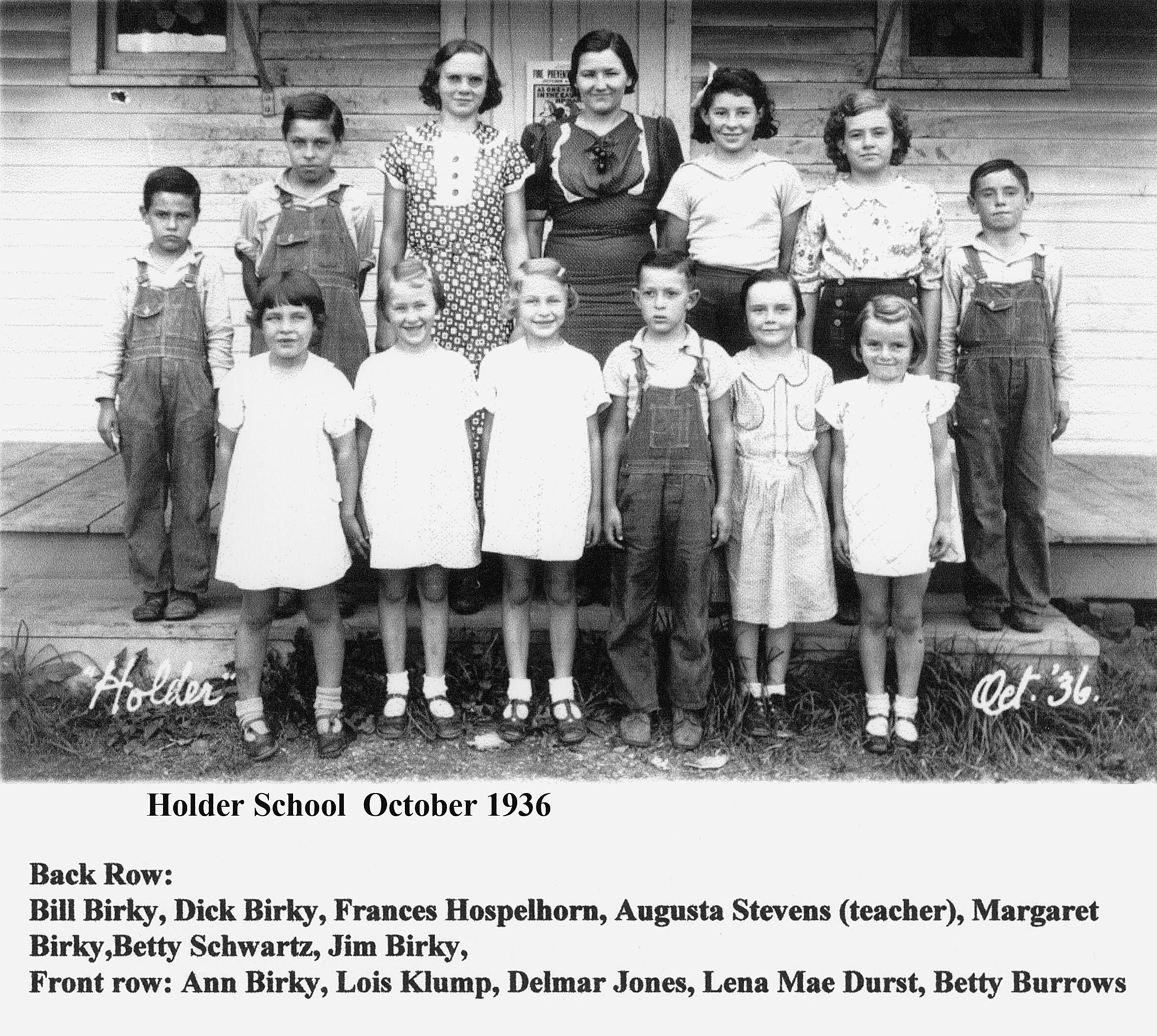 Holder School in 1936. From left to right (first row) Ann Birky, Lois Klump, unidentified, Delmar Jones, Lena Mae Durst, and Betty Burrows; (second row) William Birky, richard Birky, frances Hospelhorn, Augusta Stevens (teacher), Margaret Birky, Betty Schwartz, and James Birky.