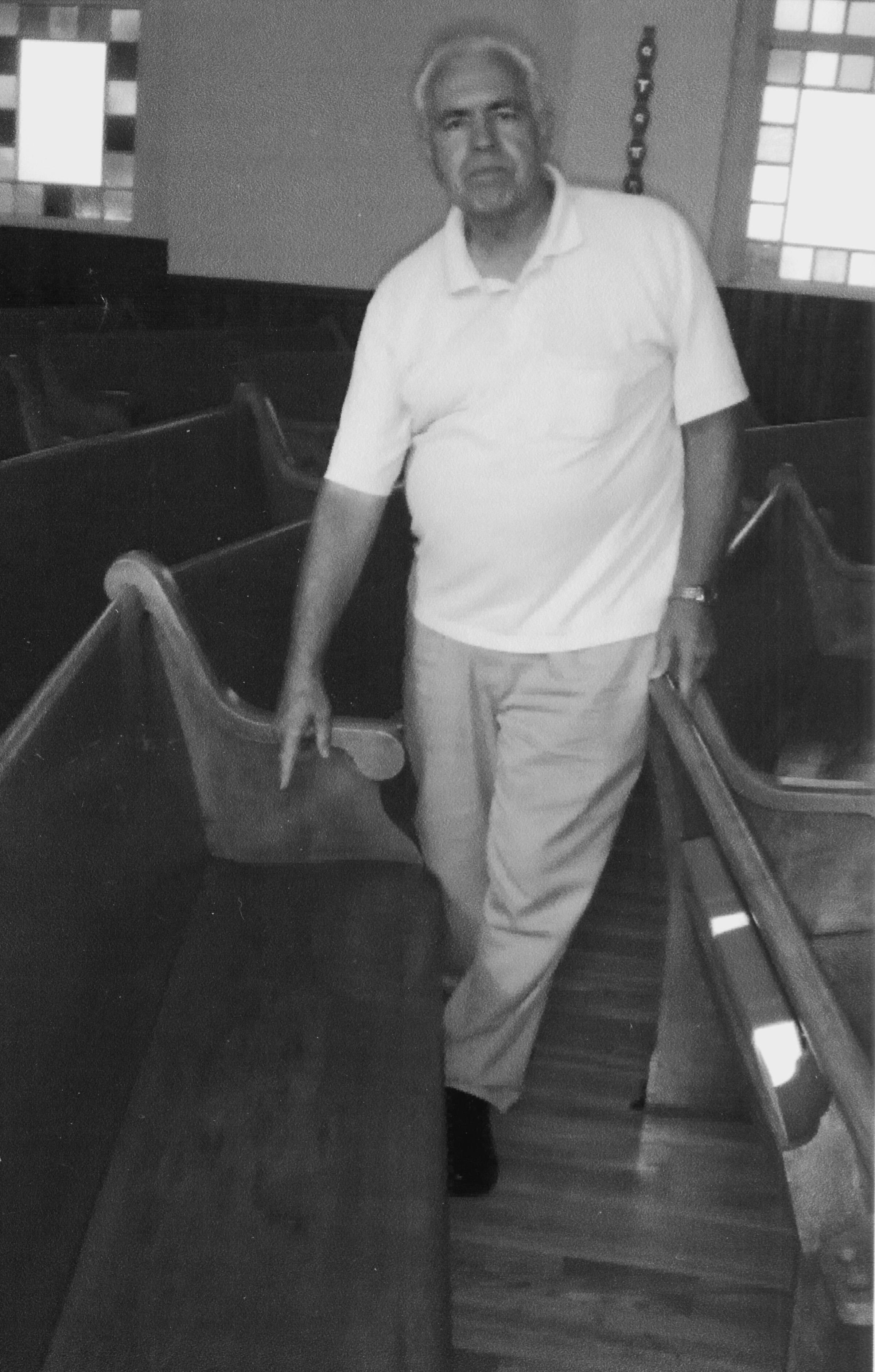 Wayne Stotler points to were a chandelier had fallen in the1890s at the Hudson Baptist Church.