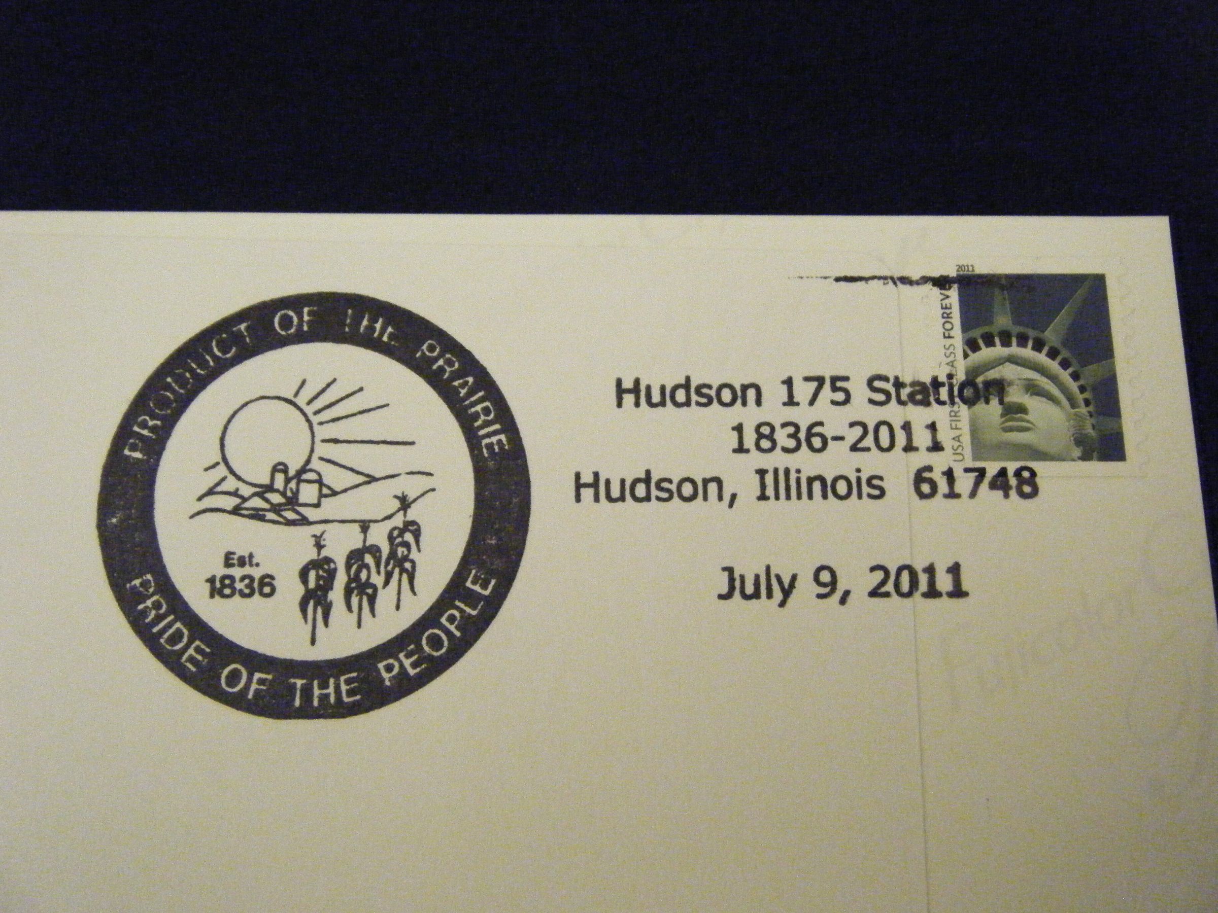 Commemorative postcard depicting important historic people and places in Hudson. Top row from left to right: Hudson School 1906, The Hubbard House, Elbert Hubbard, Front Street scene c. 1920. Bottom row from left to right: Charles "Buffalo" Jones, Hudson train depot, the logo for Hudson, Illinois. The U S commemorative postmark especially designed for the day of celebration is on the reverse side.