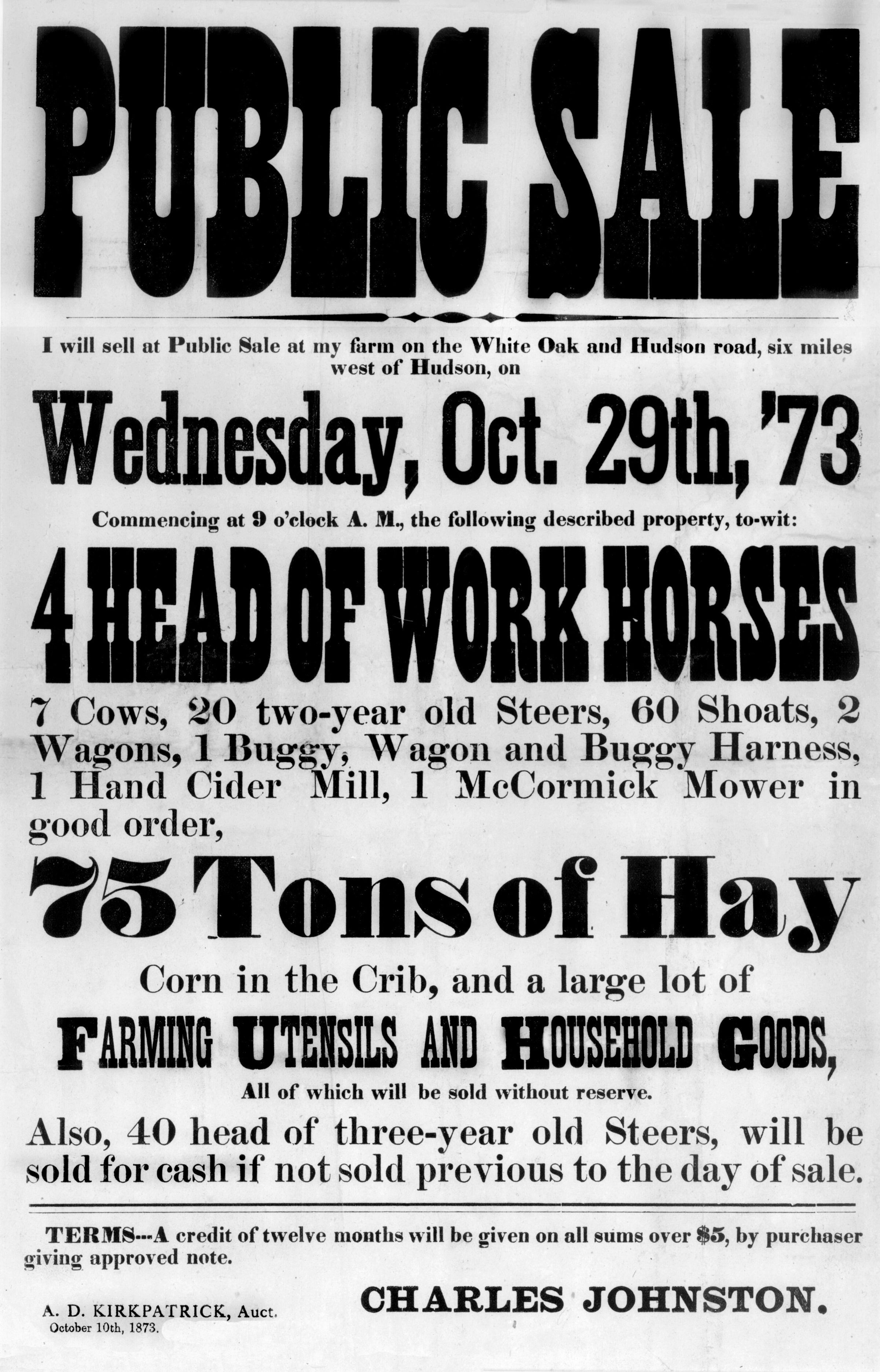 Charles Johnston farm sale flyer from 1873
