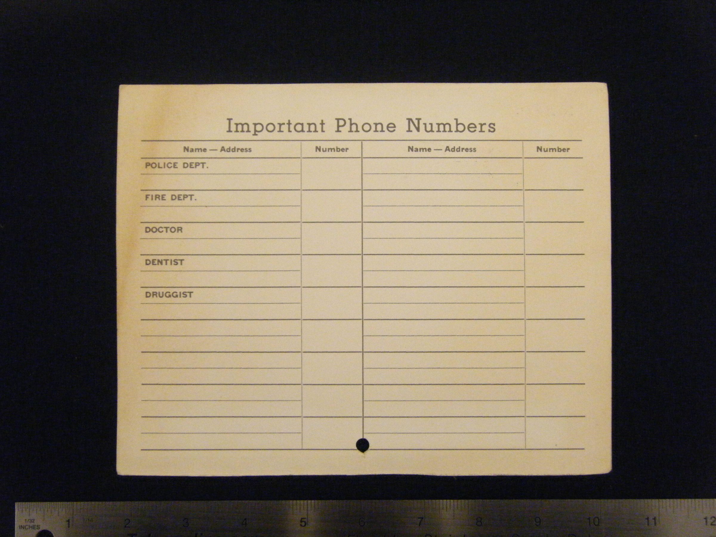 Calendar top (year unknown) with space for Important Phone Numbers on the back.