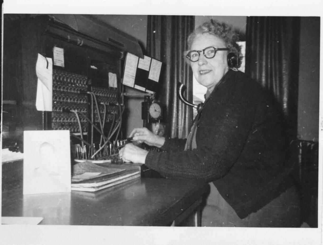 Elizabeth Bennett at the switchboard of the Hudson Telephone Company c. mid 1950s. GTE took over phone service in 1957 with dial phones.