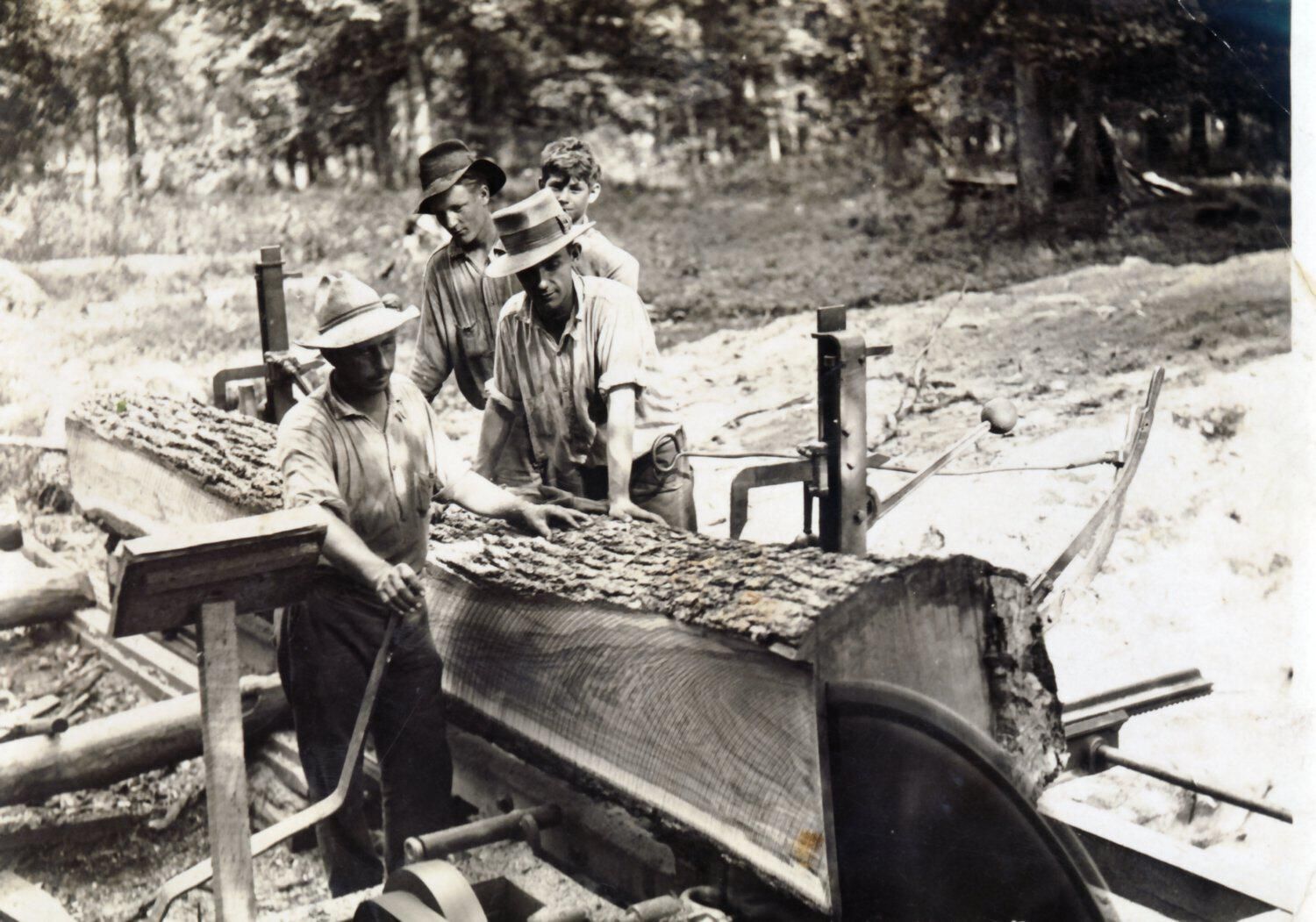 Hydraulic saw planing lumber during the construction of Lake Bloomington 1929. Pictured from left to right: Emmitt Hinthorn, Omar Vandegraft, Bo Platt, John Boinett.